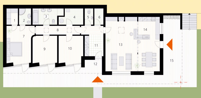 Legenda: 1 – šatňa, 2 – kúpeľňa, 3 –kúpeľňa, 4 – technológia, 5 – WC, 6 – komora, 7 – spálňa, 8 – chodba, 9 – izba, 10 – izba, 11 – zádverie, 12 – závetrie, 13 – obývacia izba, 14 – kuchyňa, 15 – krytá terasa