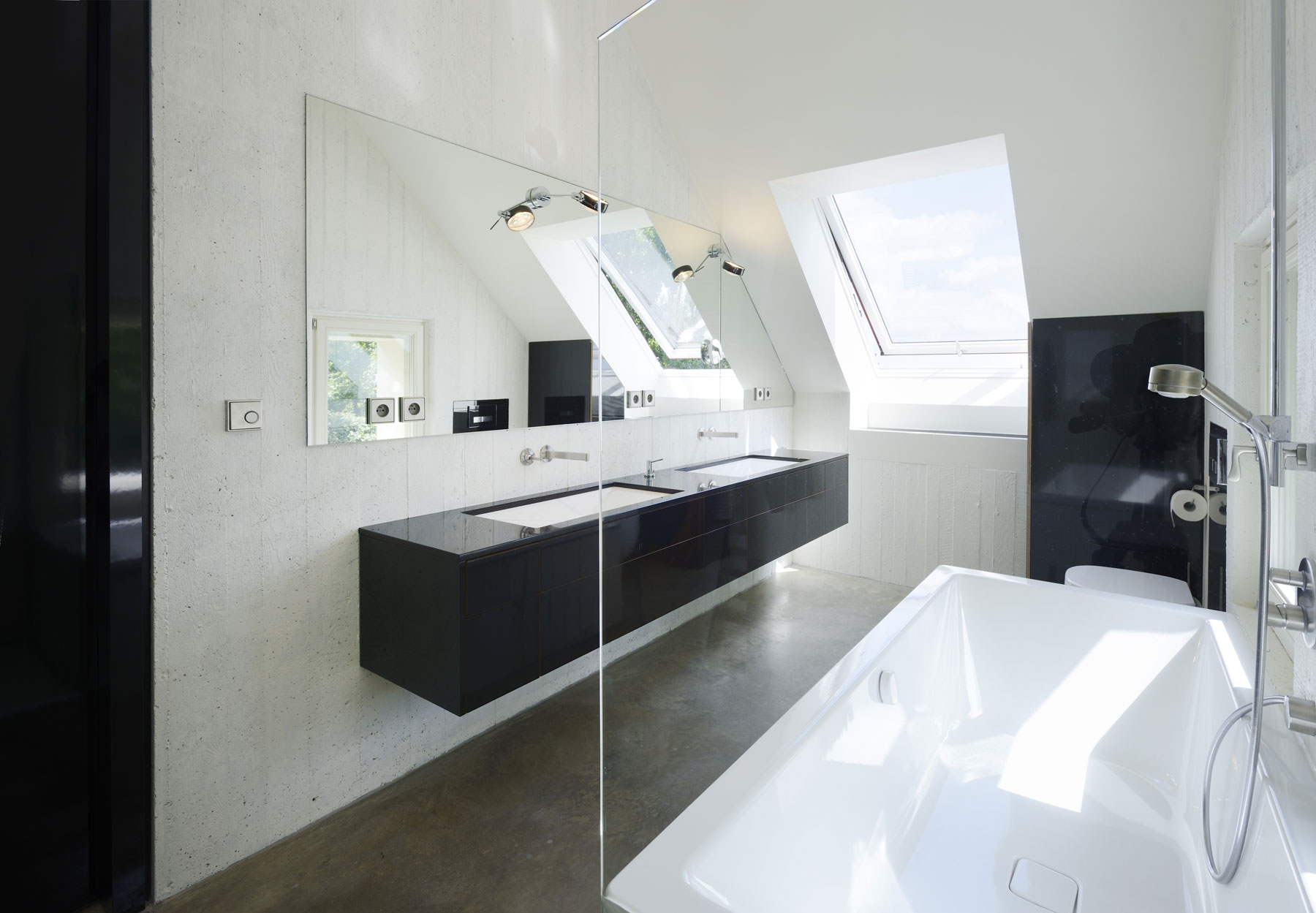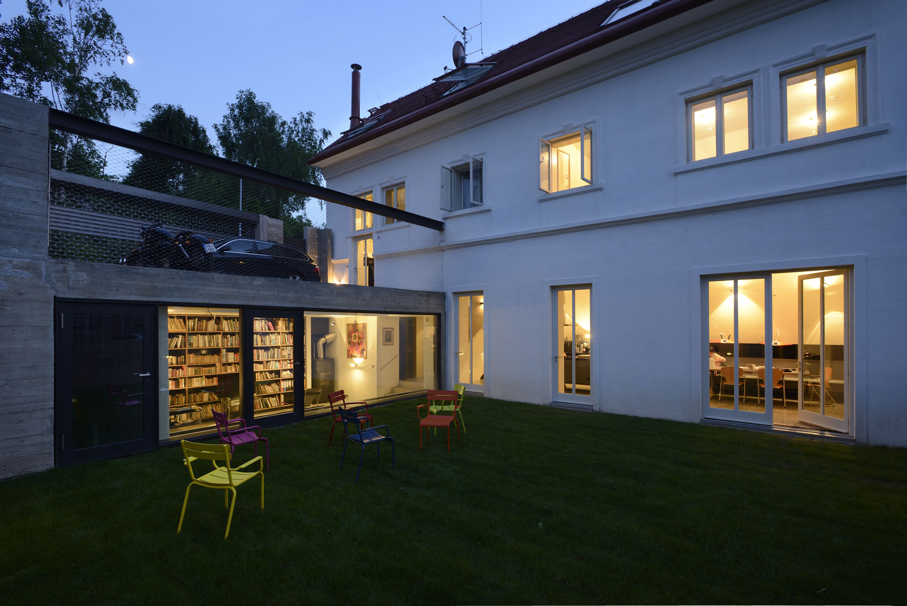 Téma masívneho stavania pokračuje taktiež v rámci historickej časti domu, a to formou monolitického vstavania stien, stropov a schodiska. Na to nadväzujú podlahy – s úpravou strojovo hladenej betónovej dosky. Vstupná hala vedie priamo do priestoru medzipodesty. Horné dve podlažia obsahujú izby a dve kúpeľne. Prízemie s jedálňou a kuchyňou smeruje do átria so záhradou. Všetky miestnosti sú prístupné z dlhej chodby, ktorá vedie pozdĺž západnej obvodovej steny.