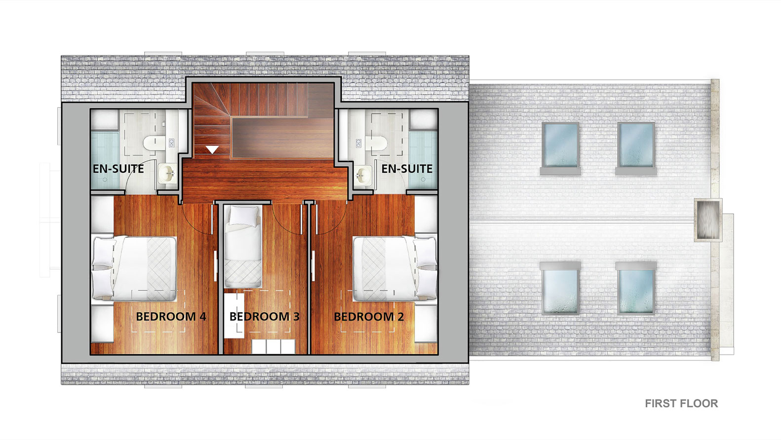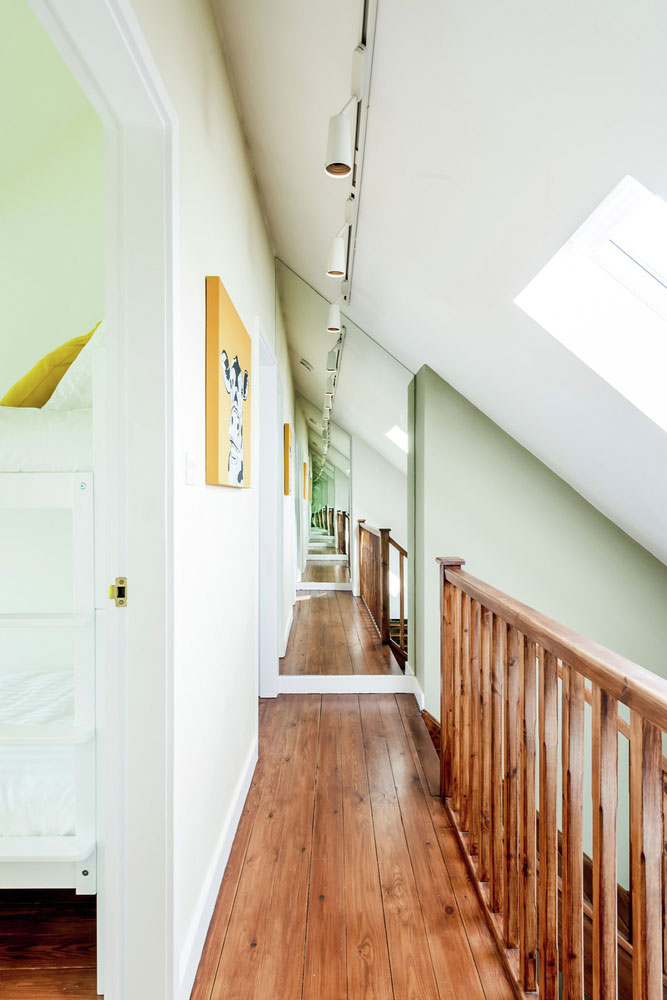 Oknám teda prispôsobili aj prístavbu poschodia, ktoré umiestnili tak, aby nemuseli pozmeniť umiestnenie či tvar žiadneho okna. Nové poschodie je teda čiastočným podkrovím, ktoré presvetlili novými stropnými oknami a umiestnili do jeho priestoru tri spálne a dve kúpeľne. Podkrovie sa nachádza iba v určitej časti priestoru, zvyšná časť ostala v otvorenej plnej výške, pričom stropné trámy architekti odhalili a pod nimi umiestnili priestrannú kuchyňu a jedáleň. V časti, nad ktorú nadstavili podkrovie, sa rozhodli vytvoriť obývačku, študovňu, ešte jednu spálňu a kúpeľňu.