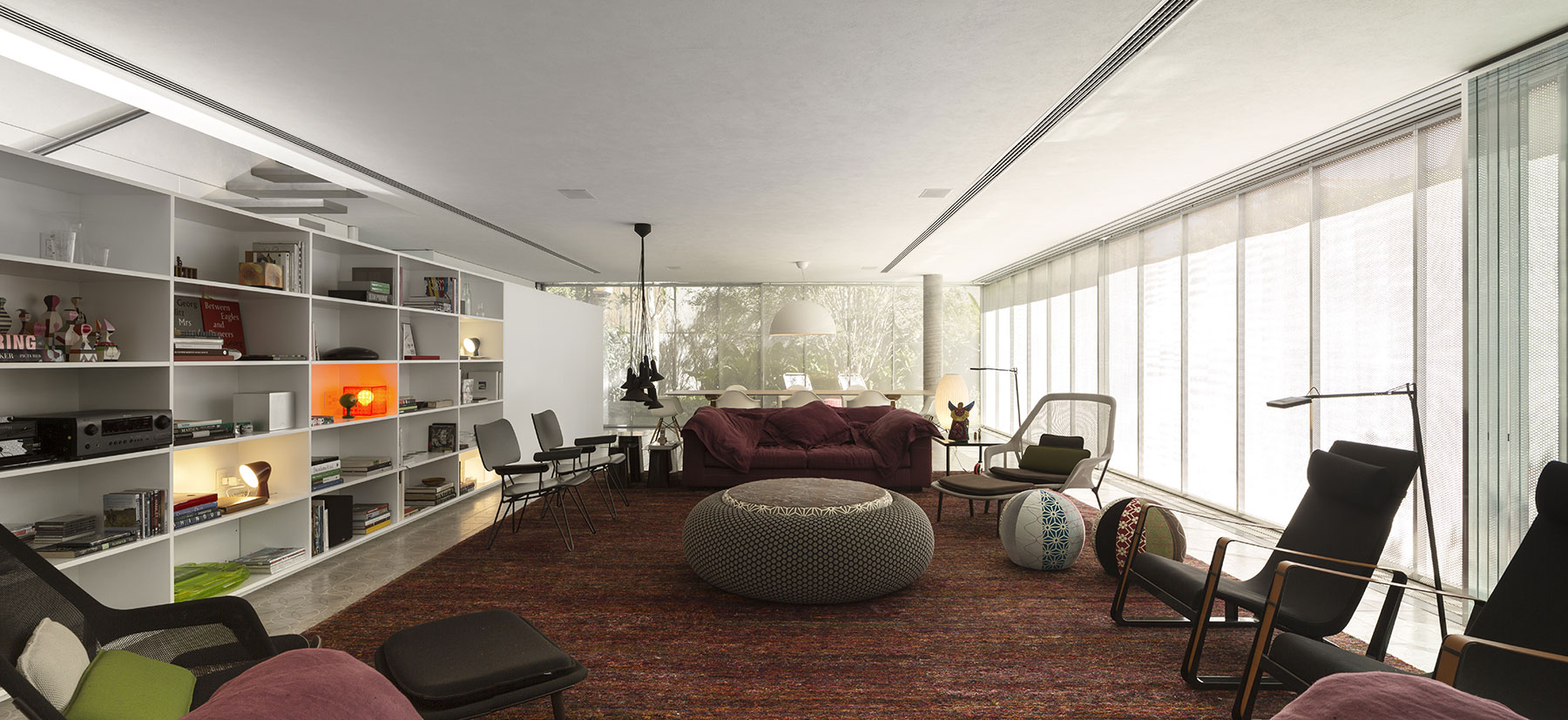 Posuvné panely na prízemí možno úplne otvoriť a z oddelených priestorov vzniká jedná veľká terasa. Aby sa zabránilo prerušeniu tohto intenzívneho dialógu medzi vonkajším a vnútorným priestorom masívnym nábytkom, použili sa buď nízke alebo transparentné kusy. Vďaka tomu vznikol otvorený priestor.