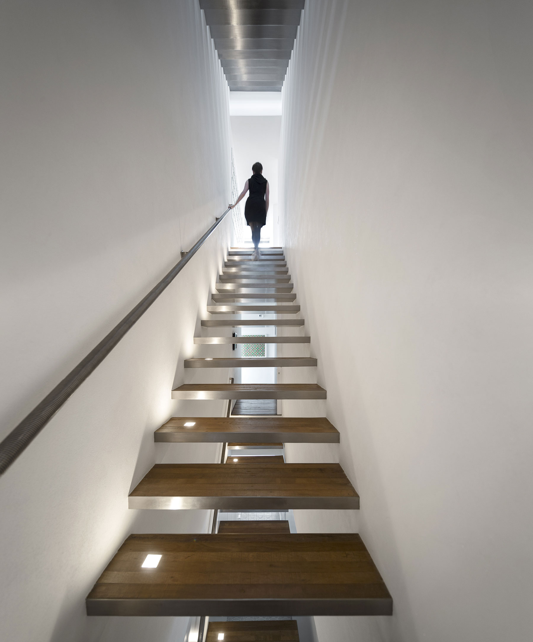Architektonické princípy podčiarkuje navrhnuté osvetlenie. Perforované panely pôsobia ako filter ostrých lúčov slnka a do interiéru tak preniká príjemné denné svetlo.