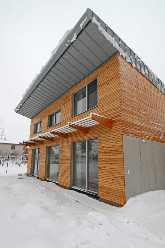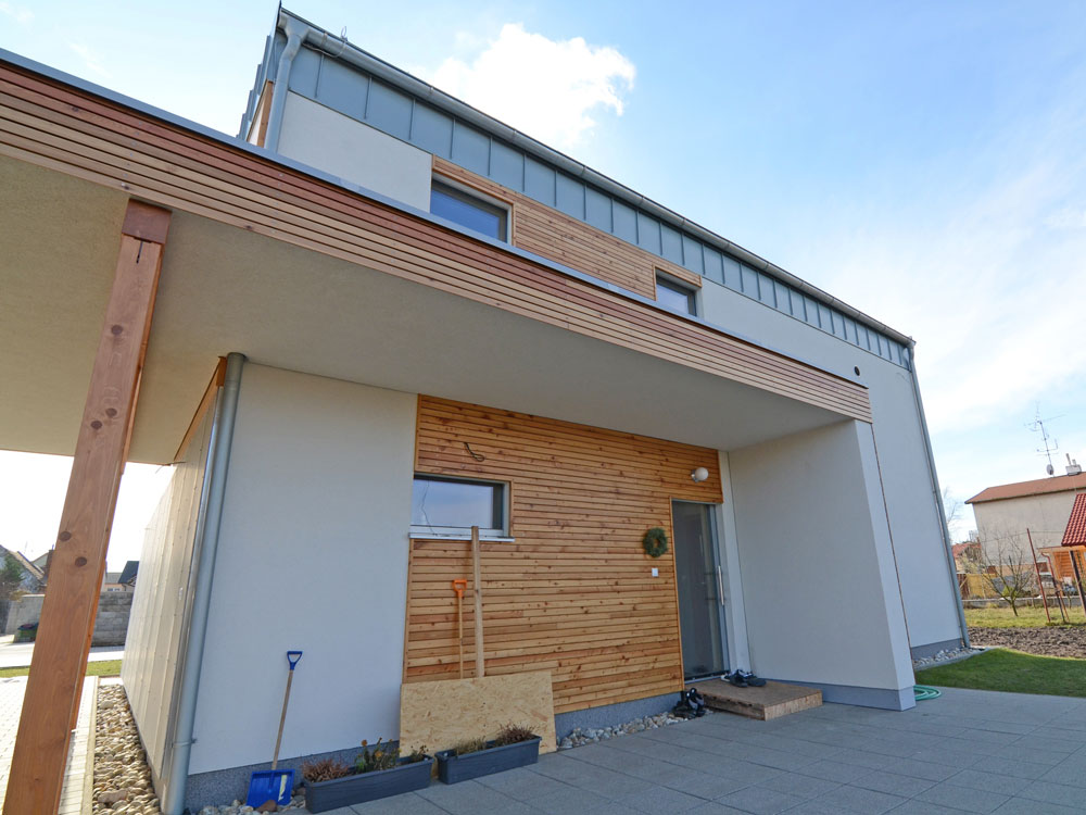 Severná fasáda so vstupom do domu. Stavba je vybavená kompaktnou jednotkou Aerosmart od firmy Drexel und Weiss (rekuperácia vzduchu, ohrev vody, dokurovanie v zimnom a ochladzovanie v letnom období), ktorá sa stará a tepelnú pohodu domu.