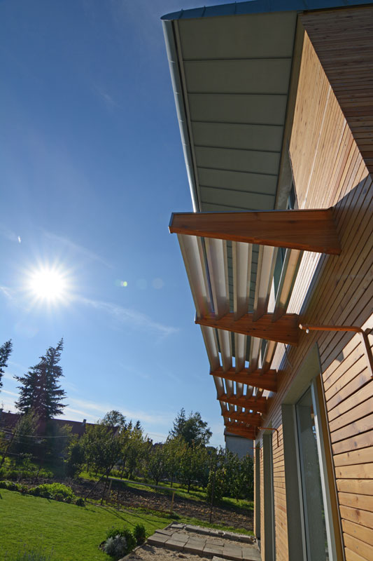 Pasívny dom je vybavený oknami s izolačným trojsklom – technológiou SmartWin. Prekrytie južnej fasády lamelovým tienením zabraňuje prehrievaniu interiéru počas letného obdobia.