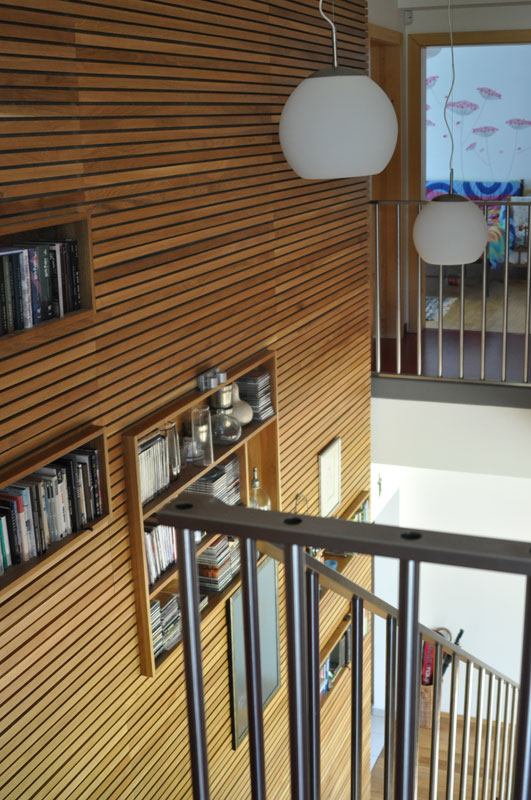 Interiér domu obsahuje prevažne prírodné materiály – drevo, nepálenú tehlu, ktoré zabezpečujú pohlcovanie vlhkosti a akumuláciu tepla. Tým sa aj pri ľahkej konštrukcii domu zabezpečia ideálne životné podmienky. |