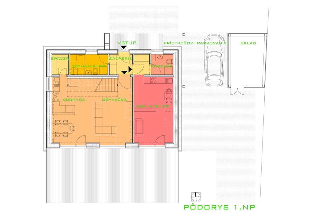 Pôdorys prvého nadzemného podlažia poukazuje na striktné rozdelenie dennej a nočnej časti domu. V dolnej časti je situovaná rozľahlá obývacia izba spojená s kuchyňou a jedálenským kútom. K priestorom prislúcha hygienické a technické zázemie, komunikačné prepojenie zabezpečuje priamočiare schodisko. Súčasťou spodného podlažia je aj menšia bytová jednotka. Plánuje sa využiť ako ateliér.