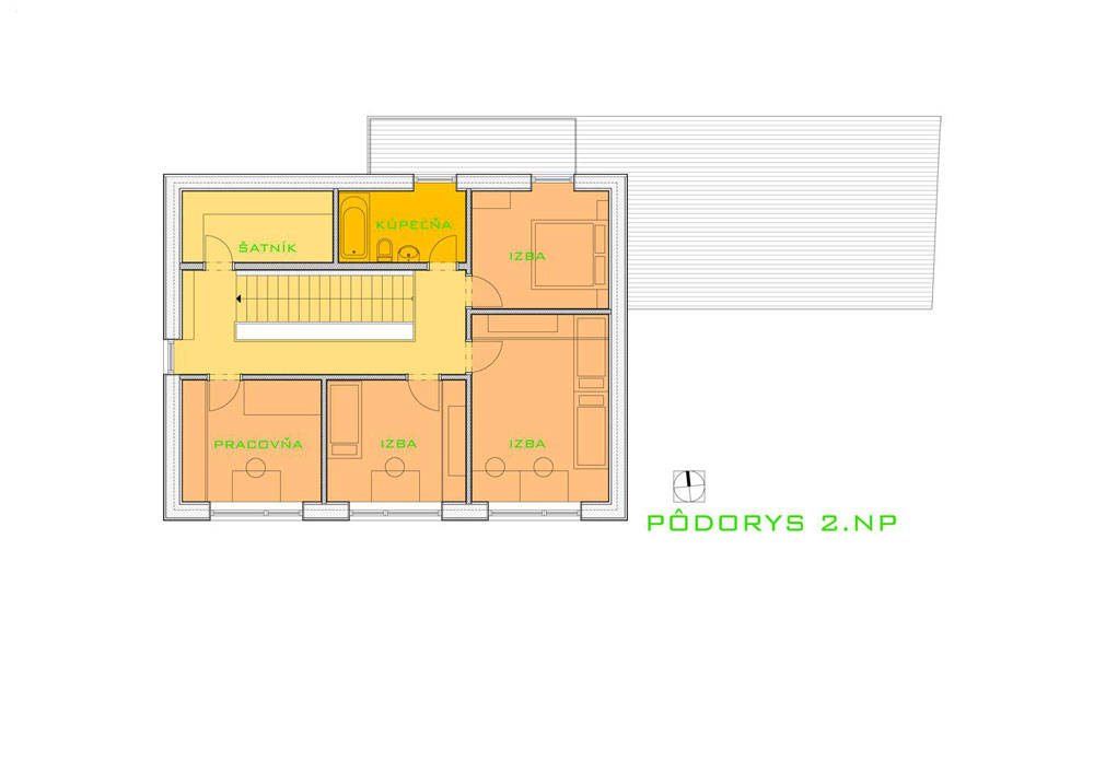 Druhé podlažie domu je venované nočnej časti. Okrem troch spální tu nájdeme i priestor na pokojnú pracovňu. Vďaka sklonu strechy sú priestory výškovo veľkorysejšie.