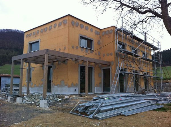 Fasáda je sčasti obložená dreveným obkladom a sčasti omietaná. Niektoré steny sú vymurované z nepálených tehál. Väčšinu stien pokrýva hlinená omietka, vzhľadovo prijemný materiál, vďaka ktorému povrch pôsobí veľmi mäkko. Použila sa aj kombinácia sadrokartónu s maľovkou alebo tapetou.