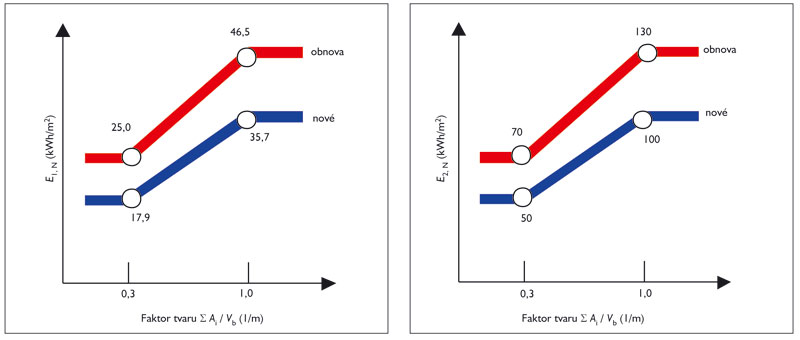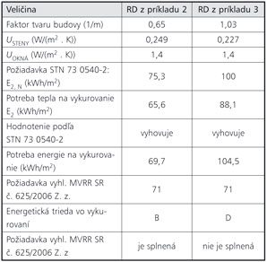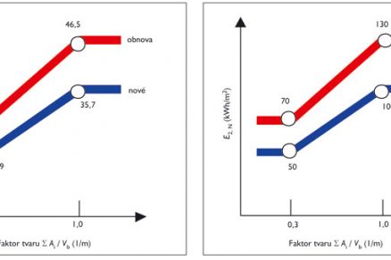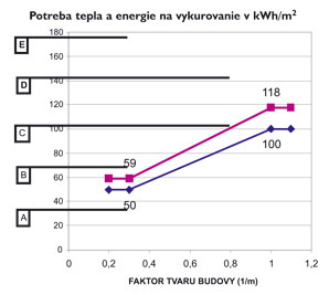 Z pohľadu na údaje na obr. 1 a tab. 2 je zrejmé, že na to, aby budova bola v triede B nestačí splniť požiadavku energetického kritéria v STN 73 0540-2. Všimnime si situáciu pri rodinných domoch. Tie majú faktor tvaru od 0,60 do 1,2. Teda potrebu tepla na vykurovanie od 71,4 do 100 kWh/m2.
