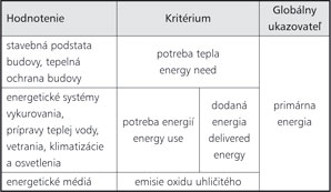 Najčastejšie sa ako kritérium hodnotenia používa primárna energia. Ako doplnenie hodnotenia sa udávajú emisie oxidu uhličitého. Takáto situácia je vo väčšine krajín EÚ, kde majú skúsenosti s energetických hodnotením budov. U nás zavedené kritérium hodnotenia vo vyhl. 625/2006 Z. z. [5] pre zaradenie budovy do energetickej triedy je tzv. globálny ukazovateľ budovy. Je to celková dodaná energia v kWh/m2 podlahovej plochy. Teda v tomto kritériu nie sú zohľadnené palivovo-energetické zdroje. Neuralgickým problémom je aj zohľadnenie obnoviteľných zdrojov energií v budovách diaľkového vykurovania. V dodanej energii nie sú započítané obnoviteľné zdroje energií, napríklad v aktívnych solárnych systémoch.