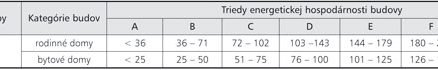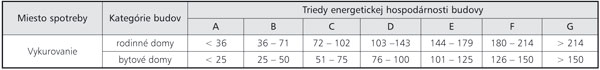 Škály energetických tried pre vykurovanie vo vyhláške MVRR SR č. 625/2006 Z. z. [5] sú v tab. 2 pre vybrané kategórie budov (rodinné domy a bytové domy). Minimálne požiadavky tohto právneho predpisu tvoria hornú hranicu energetickej triedy B. V tab. 2 je uvedená hodnota potreby energie na vykurovanie, teda potreba tepla na vykurovanie zvýšená o energiu na krytie tepelných strát vykurovacieho systému.