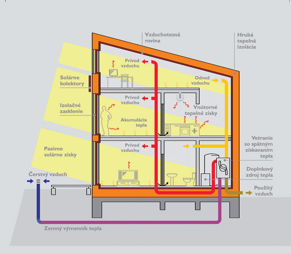 Kvalitná tepelná izolácia obálky domu nesmie byť prerušená tepelnými mostmi či netesnosťami. Okná musia účinne brániť únikom tepla z domu. Vetrací systém s rekuperáciou tepla zabezpečí komfortnú výmenu vzduchu pri minimálnej spotrebe energie. Zdroj tepla by mal prednostne využívať obnoviteľné zdroje energie. Úsporné domáce spotrebiče sú prirodzenou požiadavkou.