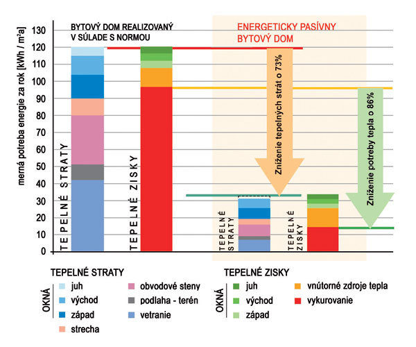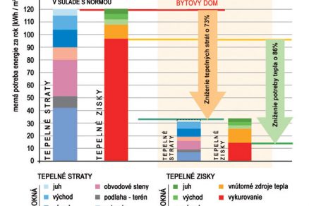 Kroky na zníženie potreby energie na vykurovanie Bilancia tepelných ziskov a strát bežného a pasívneho bytového domu