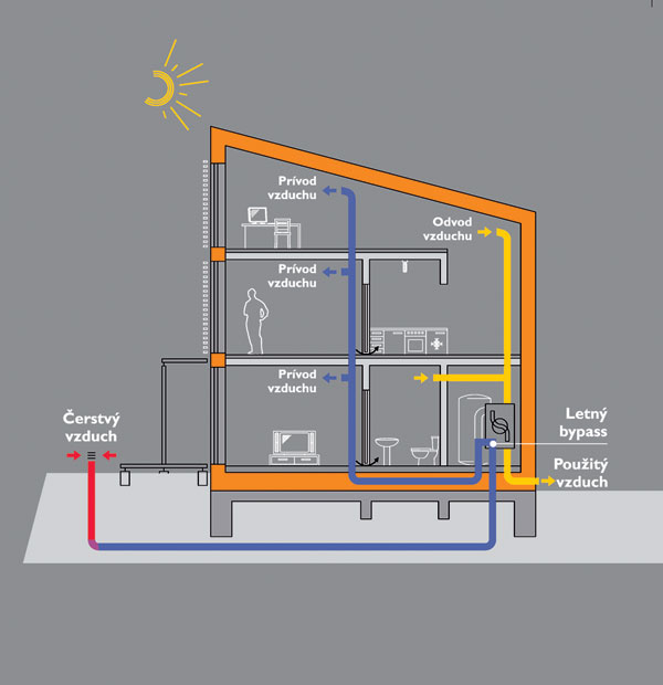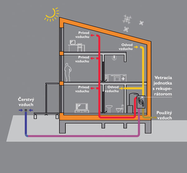Zima: čerstvý vzduch predohriaty v zemnom výmenníku odoberie v rekuperátore ­vetracej jednotky teplo z odvádzaného vzduchu.