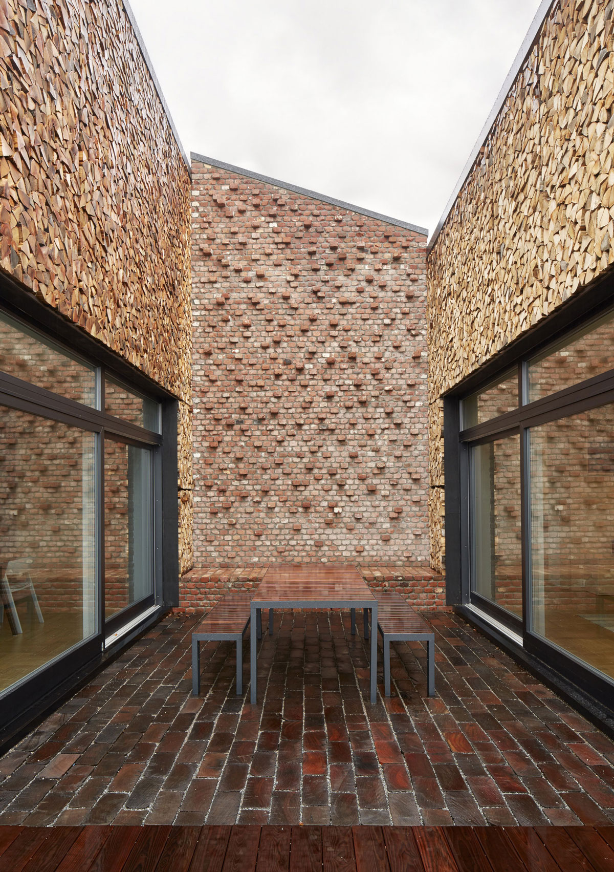 Bezprostredné okolie ZEB domu bolo koncipované ako záhrada, kde sa môže návštevník prejsť a sám objaviť a posúdiť prvky, ktoré robia tento dom výnimočným. Za zmienku rozhodne stoja malé átrium s ohniskom určené na celoročné využívanie, izba so stenami obloženými drevom a tehlami či špeciálne miesto v záhrade, nazvané „raňajkové“, situované na východnej strane s výhľadom na susedné hospodárstvo. Na tejto malej ploche sa použila dlažba z recyklovaných drevených blokov, ktoré vytvárajú príjemný povrch.