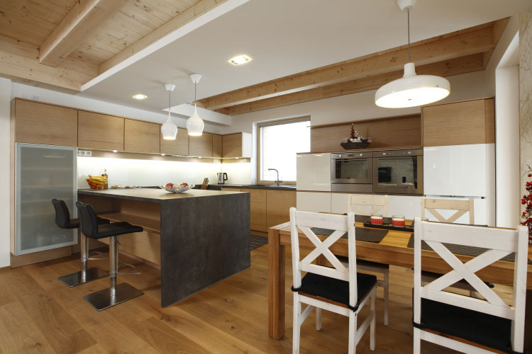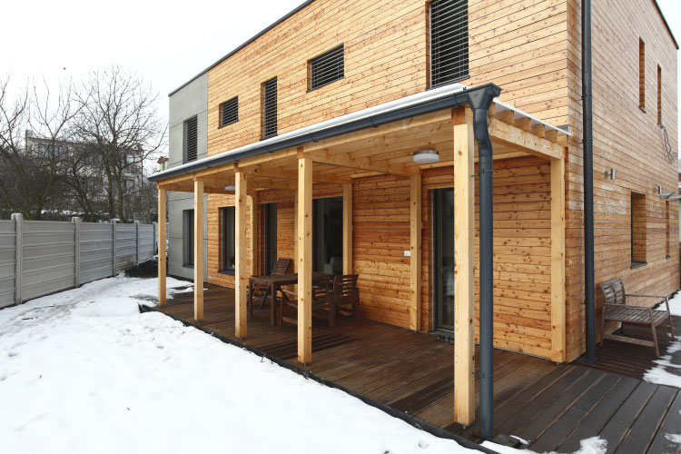 V exteriéri skrášľuje dom olejom ošetrený obklad z červeného smreka. V stenách je vytvorený 6-centimetrový inštalačný priestor, vyplnený minerálnou vlnou, kadiaľ sú vedené rozvody energie. Hlavná tepelná izolácia stien má až 36 cm a uložená je medzi boxové stĺpiky. Vnútorné opláštenie tvoria sadrokartónové dosky.
