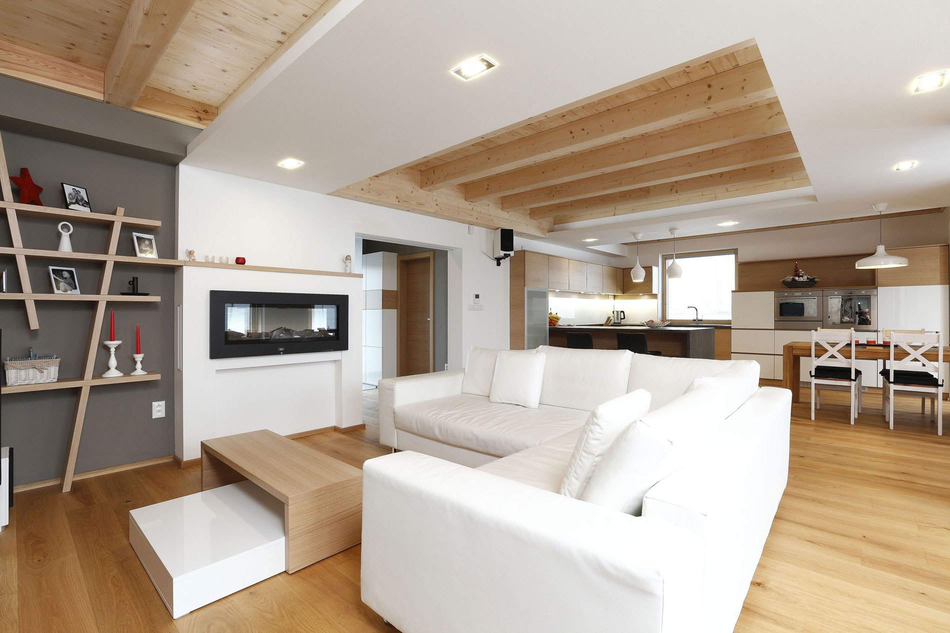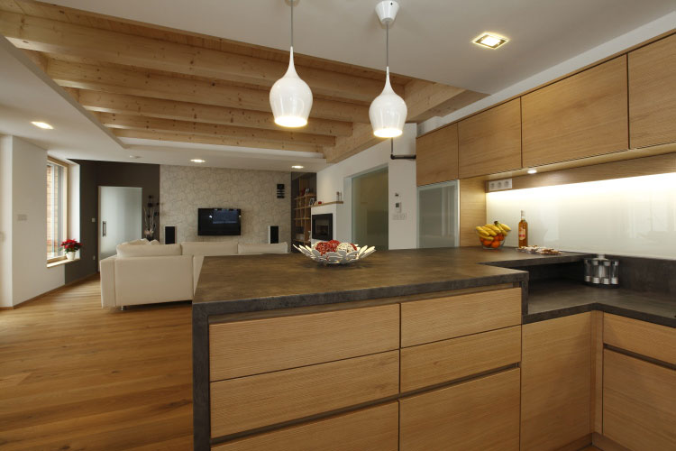Dom je nepodpivničený, dvojposchodový, tvarovo minimálne členitý. Extenzívna plochá strecha nesie okrem zelene aj fotovoltické panely na výrobu elektriny. Obytné priestory, ako spojená obývacia izba s kuchyňou, spálňa a detské izby, sú otočené na juh. Veľké zasklené plochy zintenzívňujú charakter obytného priestoru, v ktorom sa rodina zdržuje najčastejšie, a pritom perfektne zapadajú do celkového konceptu energetickej efektívnosti domu. Naopak, komunikačné priestory, kúpeľne, šatník a pracovňa sú orientované na sever.