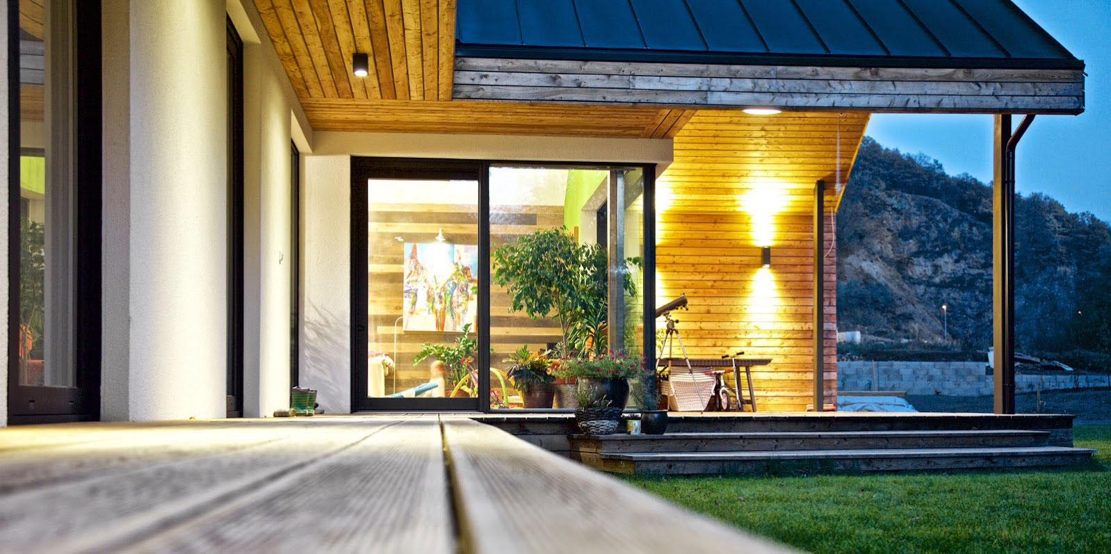 Dispozične je dom orientovaný všetkými obytnými miestnosťami na juh, pričom z každej izby sa vychádza na terasu. Terasa „levituje“ nad terénom, okolie domu je ponechané a upravené v prirodzenej podobe, lúčny trávnik prechádza na mólo nad potokom.