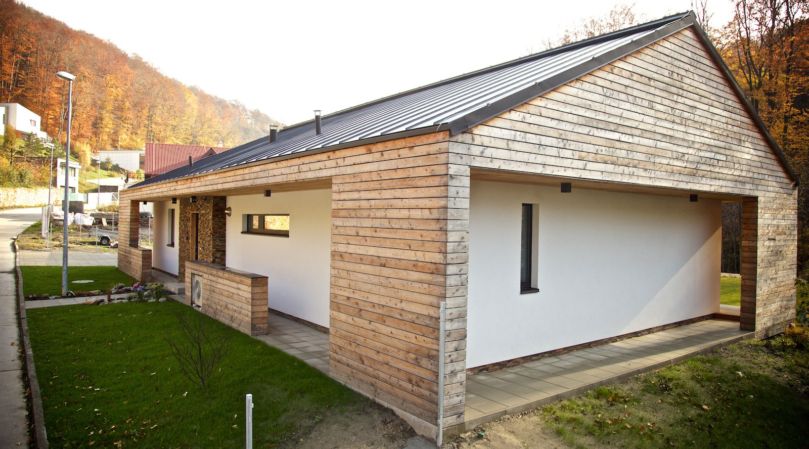 Vonkajšie materiály: biela omietka, smrekovcové obklady bez náteru, antracitové drevohliníkové okná a dvere, antracitová strešná krytina z pásového plechu.