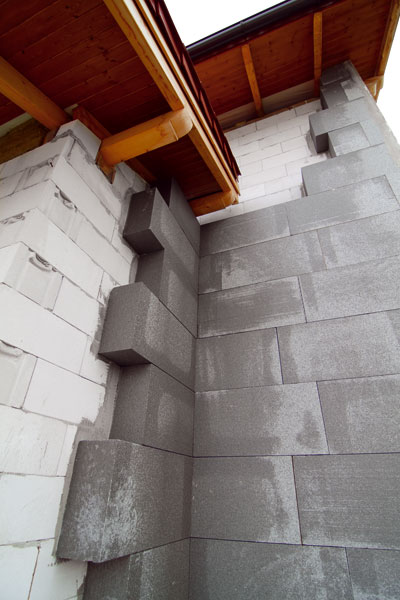 Z hľadiska úspor energie a prevádzkových nákladov či zabezpečenia vysokého komfortu bývania bol kľúčový výber systému obalovej konštrukcie domu. Majiteľ sa rozhodol postaviť dom tradičnou technológiou murovania. Rozhodol sa pre stavebný systém z bieleho pórobetónu. Obvodové steny sa vymurovali z tvárnic s hrúbkou 300 mm. Múry zaručili dostatočnú pevnosť a únosnosť konštrukcie. Na subtílnu stenu sa celoplošne lepil sivý expandovaný polystyrén s hrúbkou 250 mm. Vznikla stena so štandardnou hrúbkou a tepelným odporom R = 11,09 m2 K/W, ktorý sa odporúča pre pasívne domy.