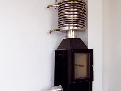 Výrobca nakoniec vytvoril extrémne tesný kozub podľa požiadaviek majiteľa. Kozub sála do miestnosti len minimálne, postačuje však na vykúrenie domu a predhrev teplej vody. Skúška Blower Door testom preukázala veľmi dobré výsledky vzduchovej nepriepustnosti pre pasívnym dom s kozubom a komínom. Prívod vzduchu do kozuba usmerňuje elektronická regulácia. Teplo prechádza do teplovodného výmenníka, ktorý je napojený na 800-litrovú akumulačnú nádrž, slúžiacu na predhrev teplej vody, a do podlahového rozvodu teplej vody na vykurovanie.