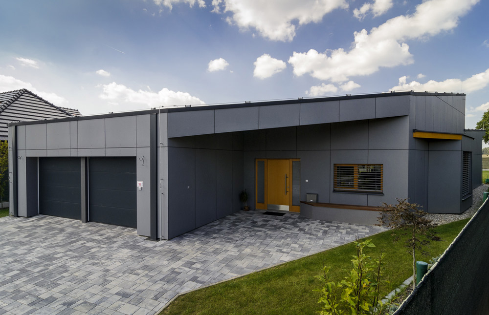 Jednopodlažný dom prikrytý dvoma pultovými strechami je zateplený pomocou drevovlákna, fasáda je vytvorená z dosák Equitone. Podpivničenie domu je len čiastočné, nachádza sa tu skladová miestnosť a technologická časť domu. Južná stena domu bola uzatvorená s ohľadom na budúce susedstvo a tiež ochranu súkromia obyvateľov domu. Vstup do domu je riešený jednoducho a nenápadne, nachádza sa zasunutý za bránami dvojgaráže.