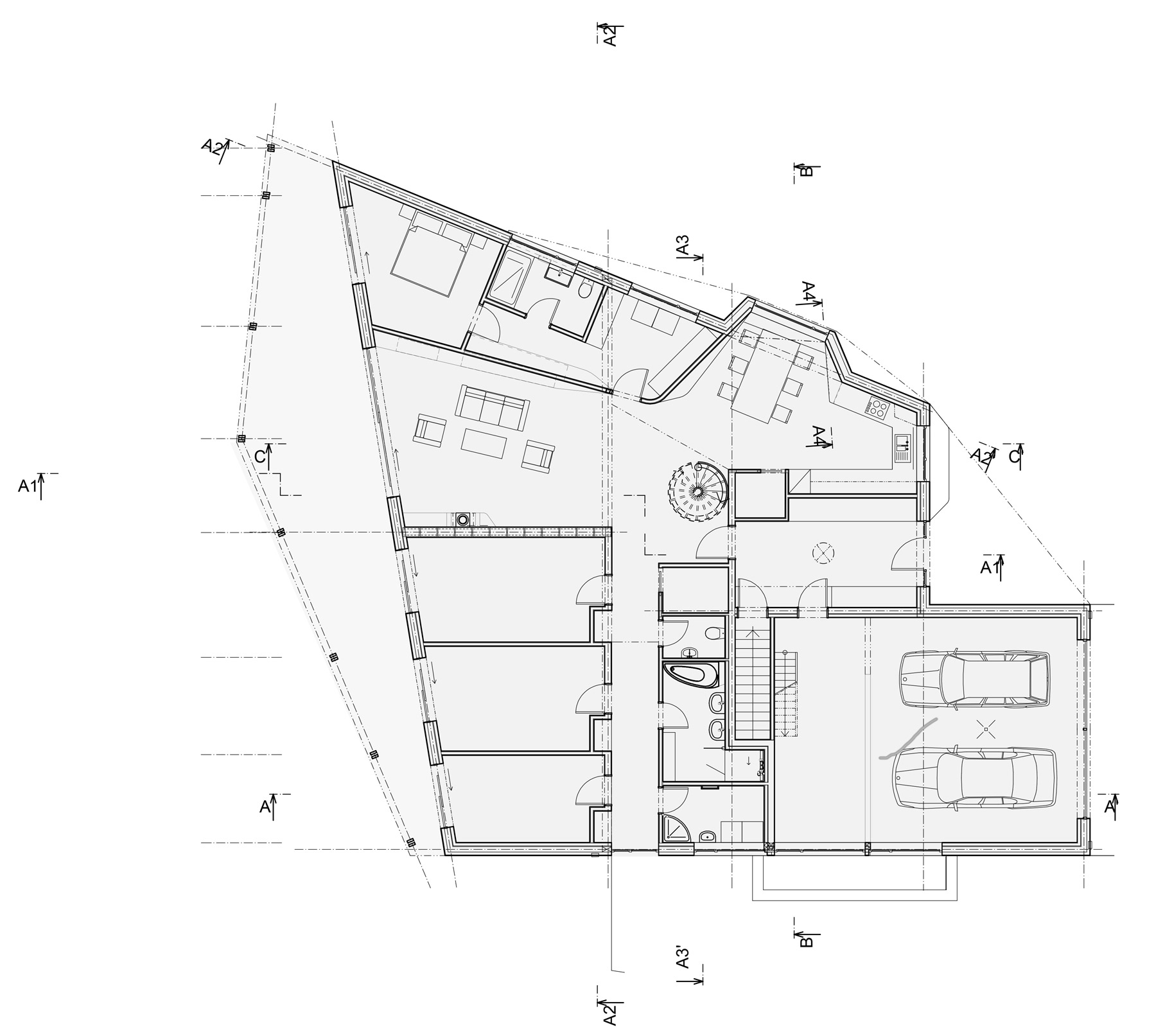„Našou tézou bolo vytvoriť čo najkompaktnejší objem z exteriéru, ktorý je vnútorne diferencovaný a bohatý. Hlavnou témou interiéru je práca so striedajúcim sa meradlom, so stlačením a uvoľnením. Dynamika priestoru je umocnená použitím syntaxe 90 × 90 × 80 × 100 a vychádza z pootočenia záhradnej steny podľa pohybu slnka. Na vytvorenie presnej pozície sme použili optimalizáciu pomocou genetického algoritmu,“ vysvetľuje architekt Jiří Vítek.