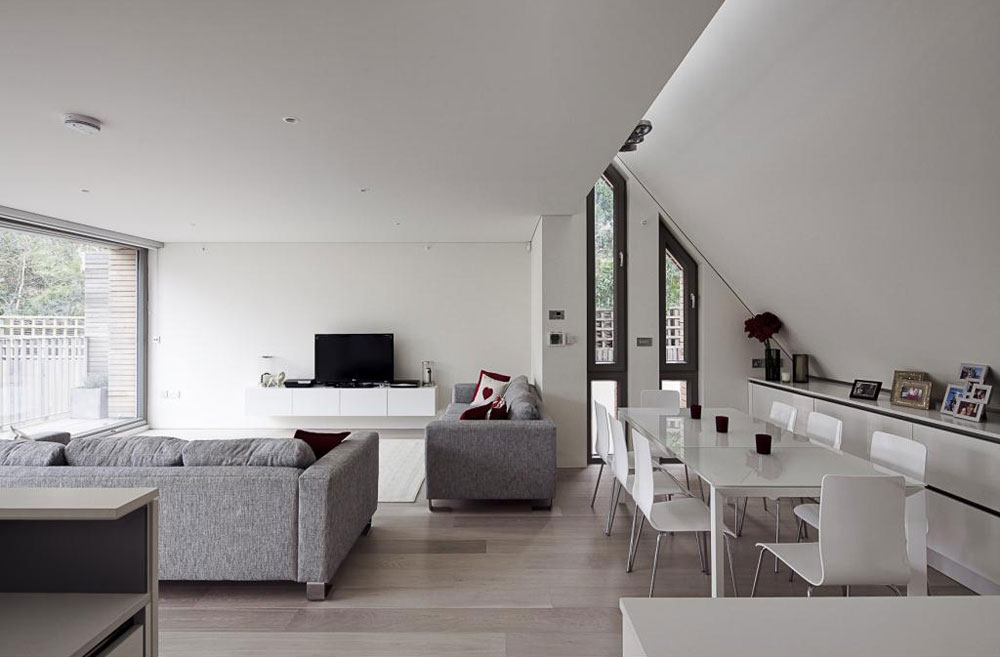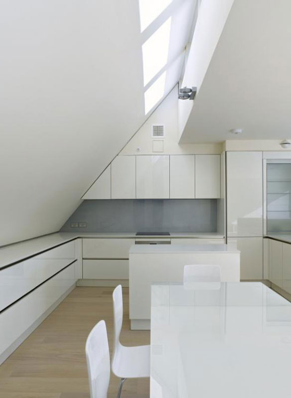 Minimalistické zariadenie kuchyne a biela farba, ktorá sa uplatnila v celom interiéri domu ešte viac podčiarkujú vzdušnosť priestoru