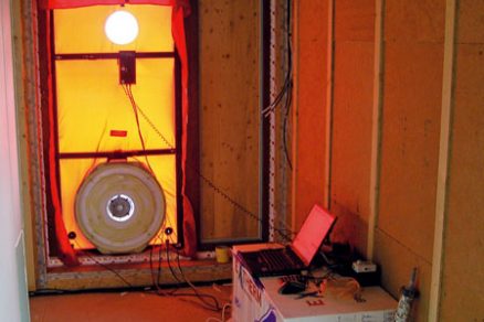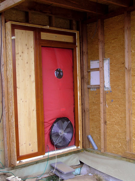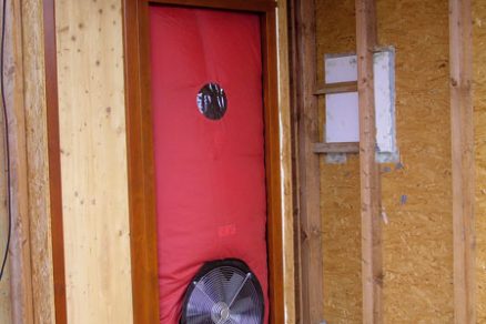 Špecifickým problémom drevostavieb je zabezpečenie vzduchotesnosti plášťa stavby. Kvalita realizácie vzduchotesného plášťa je kľúčová na zaistenie efektívnej funkcie spätného získavania tepla rekuperáciou. Vzduchotesnosť stavby sa pred kompletizáciou vnútorných povrchov overila tzv. Blower Door Testom [1]. Výsledok meraní (0,43 h-1), ktorý okrem iného predstavuje dosiahnutie dobrej kvality vzduchotesnosti obvodového plášťa, sa zohľadnil v aktualizovanom výpočte.