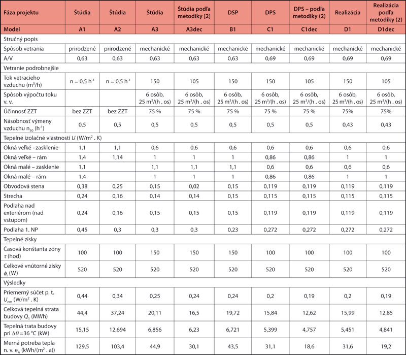 Prehľad jednotlivých parametrov rozhodujúcich pre energetickú bilanciu stavby je v rozličných fázach projektu a realizácie uvedený spolu s výsledkami energetického posúdenia v tab. 1. Zvýraznené sú vždy tie parametre, pri ktorých došlo k zmenám oproti predchádzajúcemu výpočtovému modelu. Z prehľadu je zrejmé, že v jednotlivých fázach projektu sa môže niekoľko parametrov výrazne meniť – či už vplyvom cielenej optimalizácie konštrukčného, materiálového a technologického riešenia, alebo vplyvom viac či menej subjektívnych rozhodnutí strán zúčastnených na projekte a realizácii stavby.
