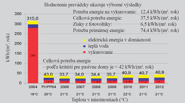 Prehľad spotreby energie pred rekonštrukciou a po nej v porovnaní s výpočtom podľa súboru opatrení pri navrhovaní pasívnych domov 2004. Napriek tomu, že teplota v miestnostiach bola o 1 až 2 °C vyššia, skutočná spotreba energie bola nižšia, než sa očakávalo