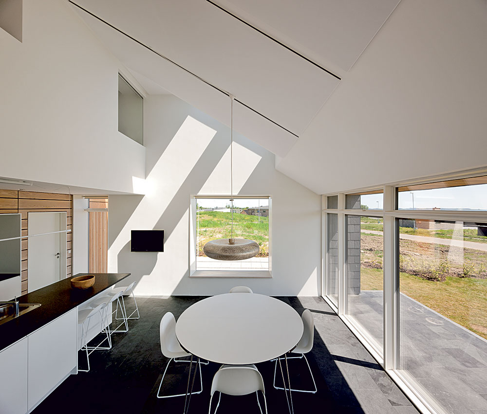 Rodina Kristensenovcov oceňuje podľa svojich slov nadštandardné množstvo denného svetla, kontakt s okolitou krajinou a nádherný výhľad na oblohu vďaka veľkým plochám okien. Počas letných nocí strešné okná ani nezatemňujú, pretože si vďaka nim užívajú neobvyklé svetlo letných nocí, typických pre túto oblasť. V lete rodina prakticky vôbec nepoužíva elektrické osvetlenie, pretože strategicky rozmiestnené fasádne okná zaisťujú spolu so strešnými oknami nadmerné množstvo denného svetla zo všetkých svetových strán. Najlepšiemu rozptylu denného svetla veľmi pomáha svetlá povrchová úprava interiéru.
