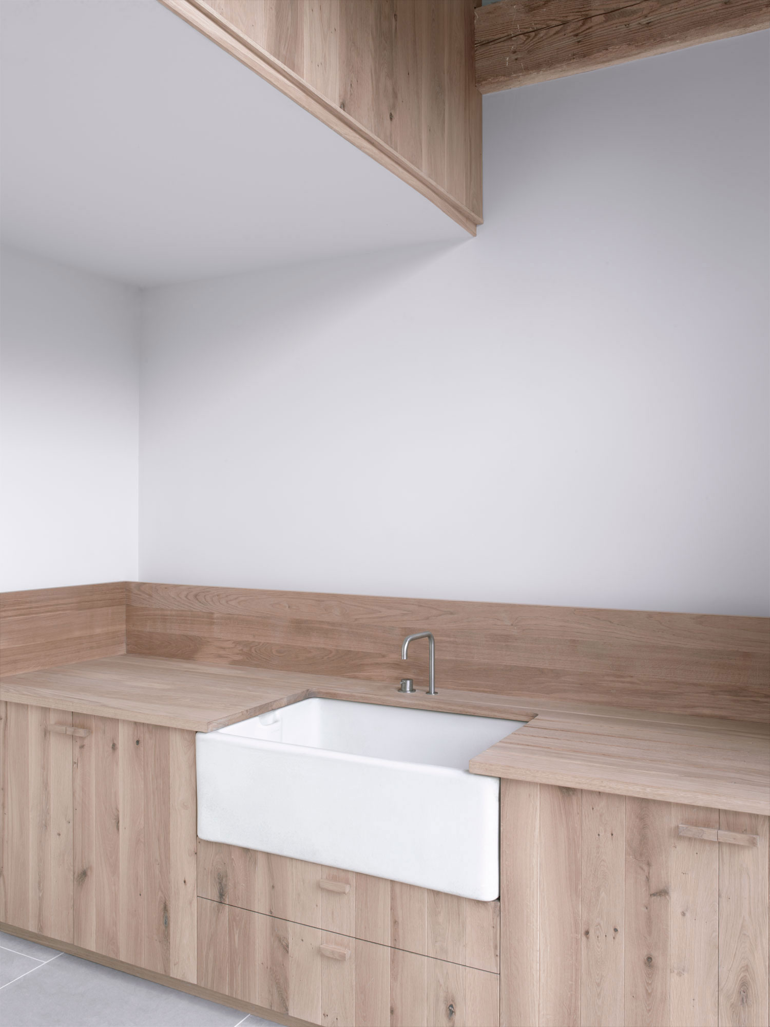 Okrem uvoľnenia priestoru je dôležitým prvkom zachovania atmosféry pôvodnej stavby maximálne využitie niekdajších materiálov. Preto je aj nový štít na južnej strane postavený z masívneho dubu, čo fasáde dodáva potrebný vzhľad pôvodnej poľnohospodárskej usadlosti.
