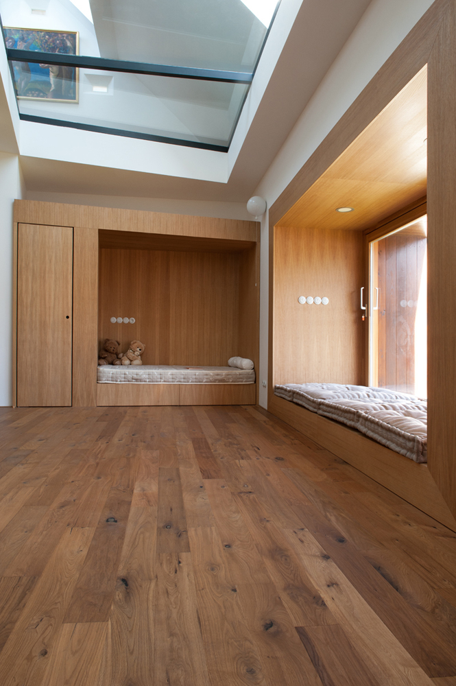 V podkroví je situovaná spálňa s kúpeľňou, ateliér a priestor galérie, ktorý umožňuje optické prepojenie so stodolou. Stodola sa vyčistila a presvetlila priehľadnými škridlami. Priestor stodoly je určený na detské hry, rodinné posedenia, oslavy a sledovanie filmov z pódia, ktoré vzniklo zaizolovaním schodiska vedúceho do pivnice pod stodolou.
