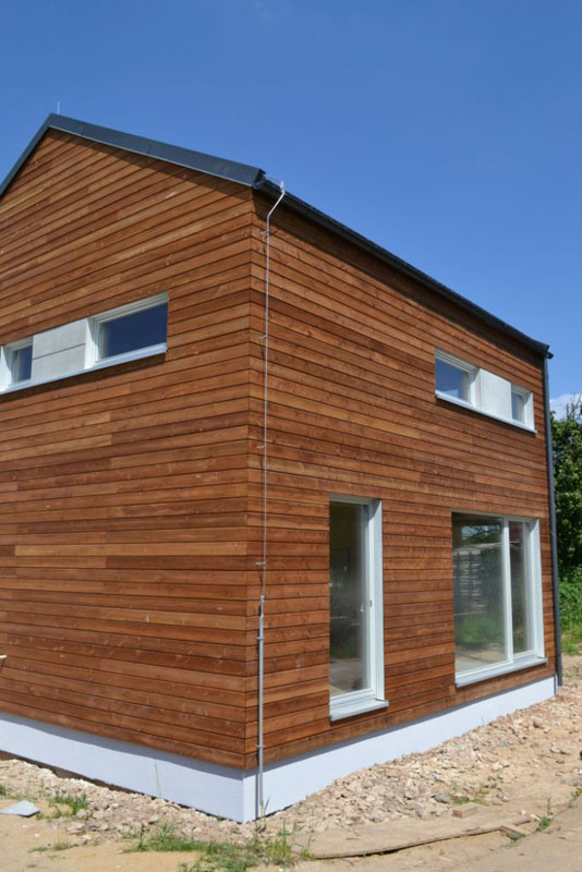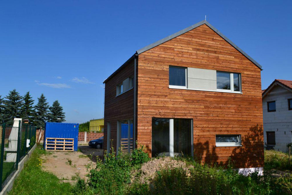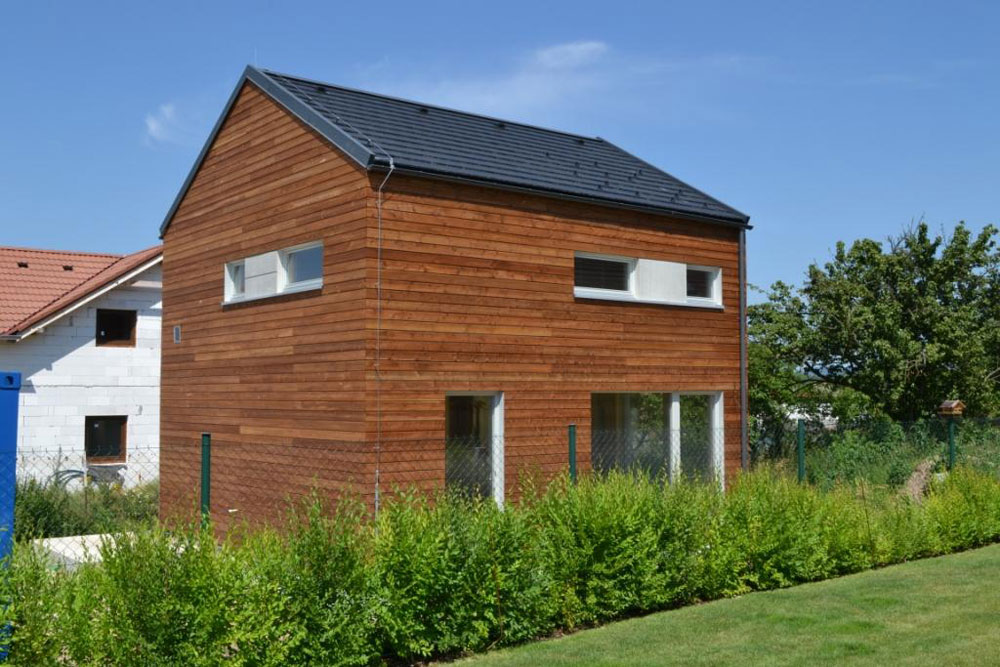 Aj napriek týmto drobným legislatívnym prekážkam bol koncept návrhu úplne jasný. Dom je orientovaný dlhšou pozdĺžnou stranou smerom na juh a na južnej fasáde sú zároveň umiestnené zasklené plochy na pohlcovanie solárnej energie. Dom je vizuálne spojený s východnou časťou záhrady, v ktorej sa nachádza malý sad. Ekologické uvažovanie obyvateľov domu je navonok vyjadrené dreveným obkladom. Kompaktný tvar, ktorý je predpokladom nízkej energetickej náročnosti, rozbíja len cembritový obklad medzi pásovými oknami. Z dispozičného hľadiska ide o štvorizobový dom s kuchyňou a kúpeľňou s využiteľnou podlahovou plochou 93,1 m2.