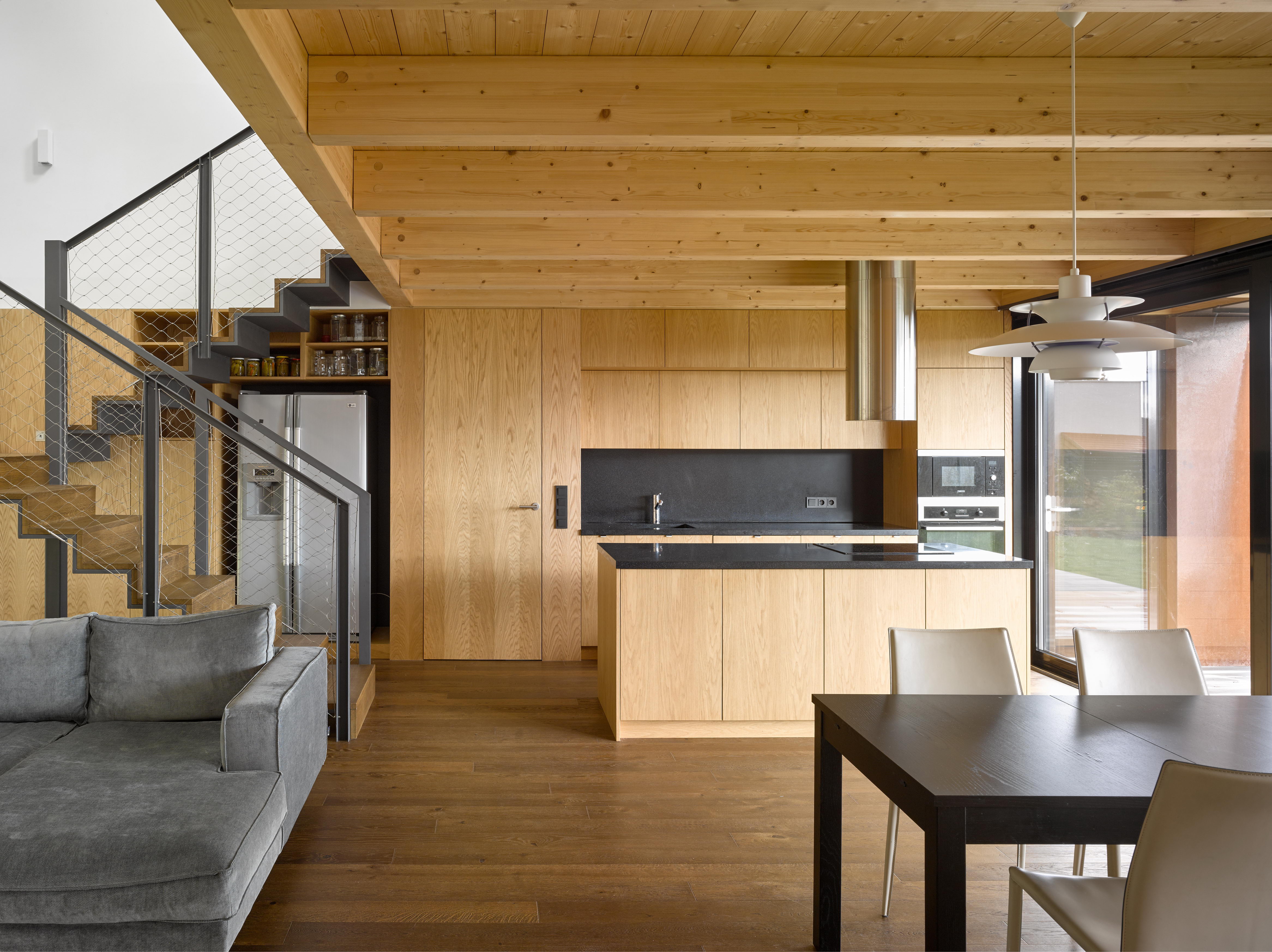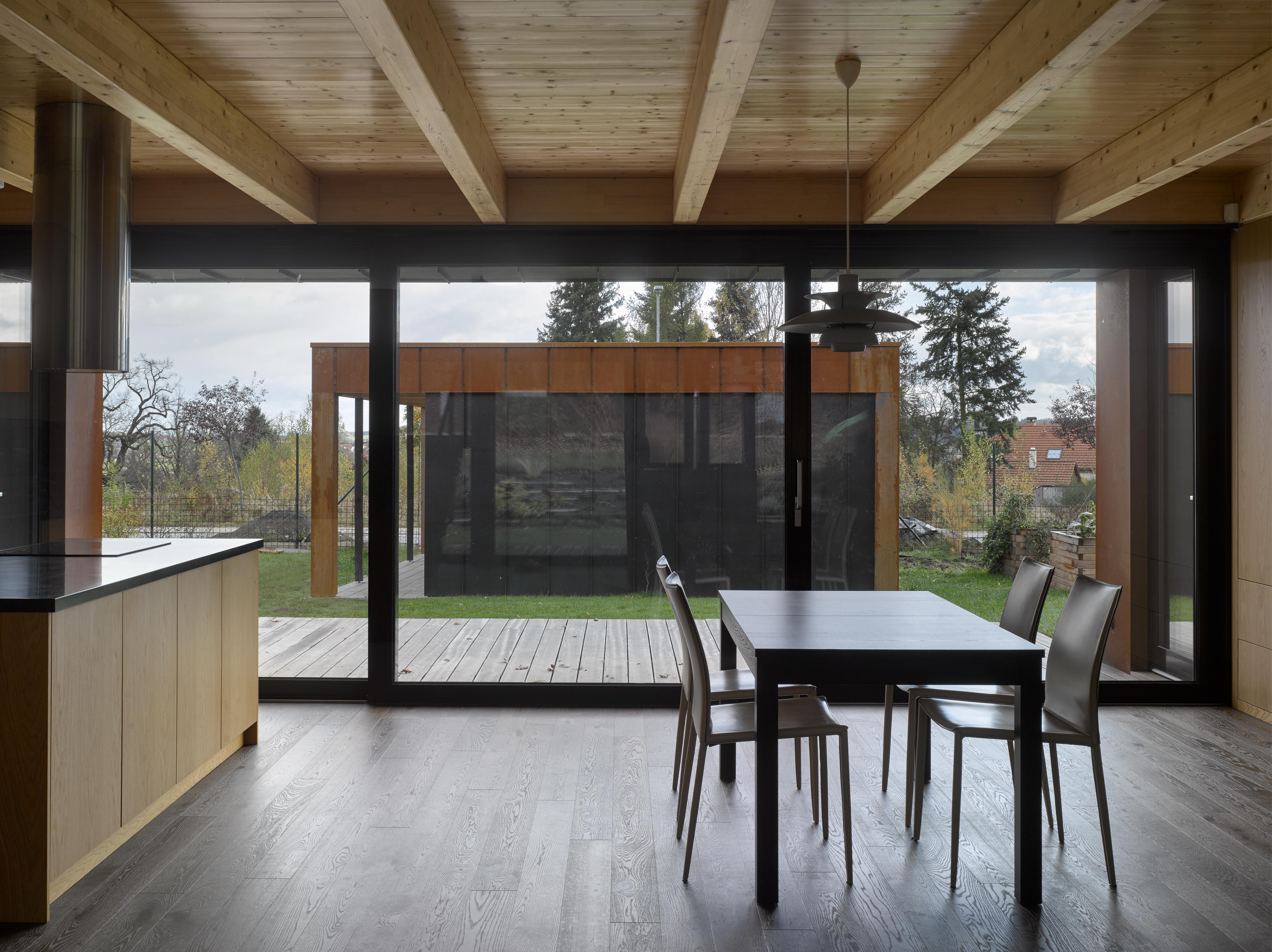 „V návrhu sme pracovali s princípmi átriového domu. Predsunutím nízkej garáže pred dom k južnej hranici pozemku sme vytvorili súkromnú optickú bariéru, a pritom sme neprišli o slnko. Objem garáže presne zodpovedá ,diere‛, ktorá zostala v dome. Veľkoformátové zasklenie z juhu i severu vytvára priehľad cez celý dom – zo slnečného juhu na zalesnený sever,“ vysvetľujú architekti svoje šikovné riešenie.