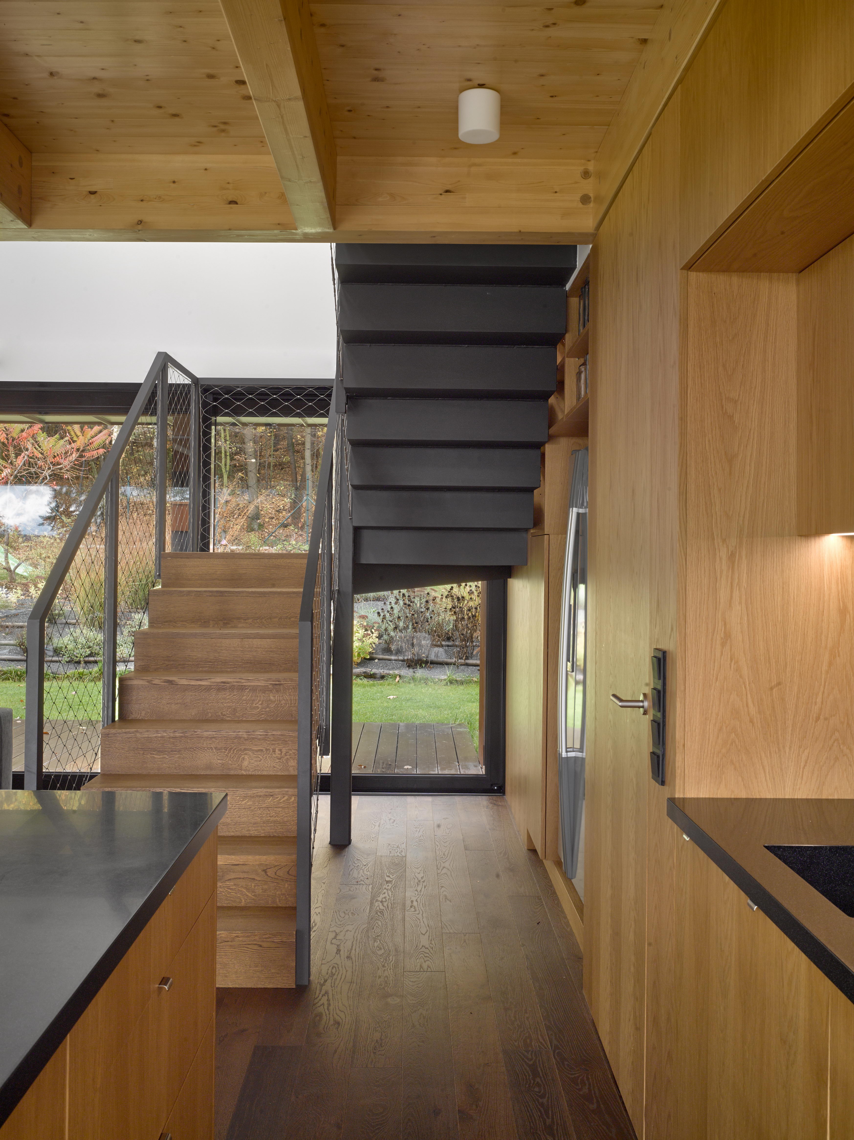 Z obývacej miestnosti s kozubom vedie aj štýlové schodisko na poschodie. Ostatné miestnosti poskytujú dostatok súkromia a príjemných výhľadov. Nábytok v celom dome je vyrobený na mieru.