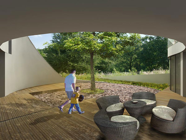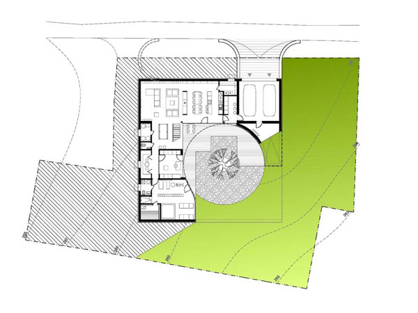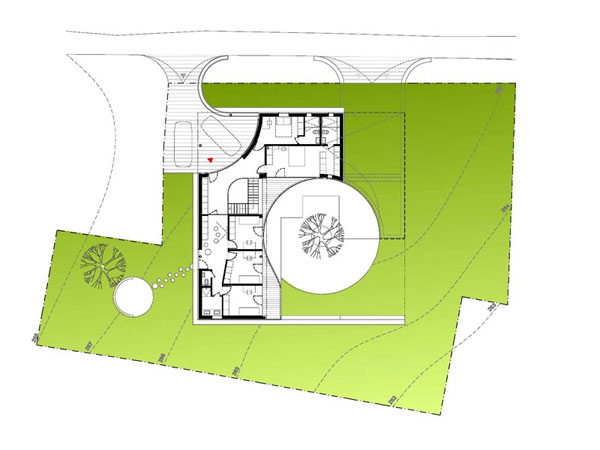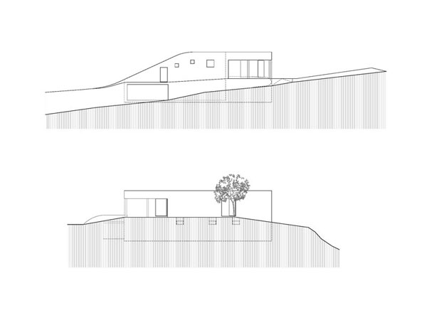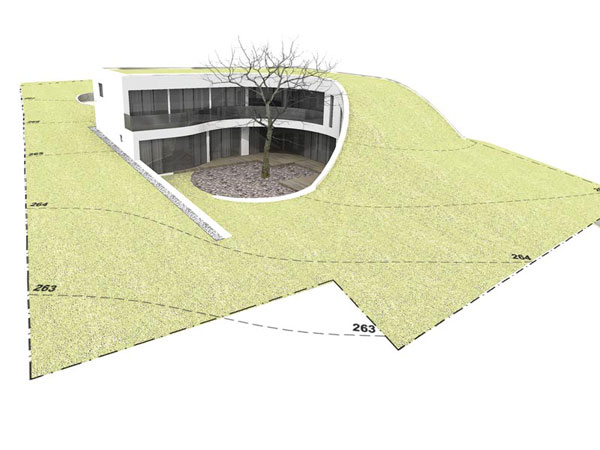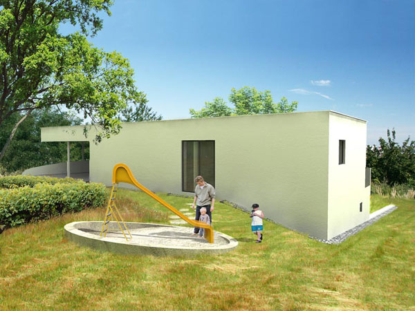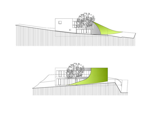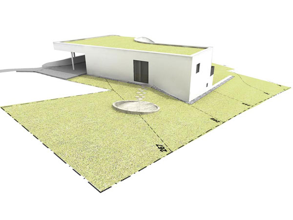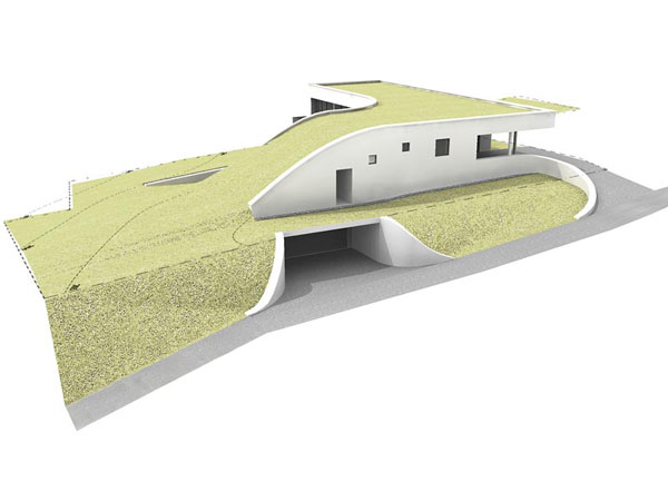 Strecha je pokrytá extenzívnym porastom, v šikmej časti trávou. Tým sa stavba stáva aj „land-artovým“ objektom. Objekt má dva vstupy vo dvoch úrovniach, čo v budúcnosti vyrieši rozdelenie domu na dve samostatné obytné jednotky: pre rodičov dole a pre deti hore s vlastnou záhradou.