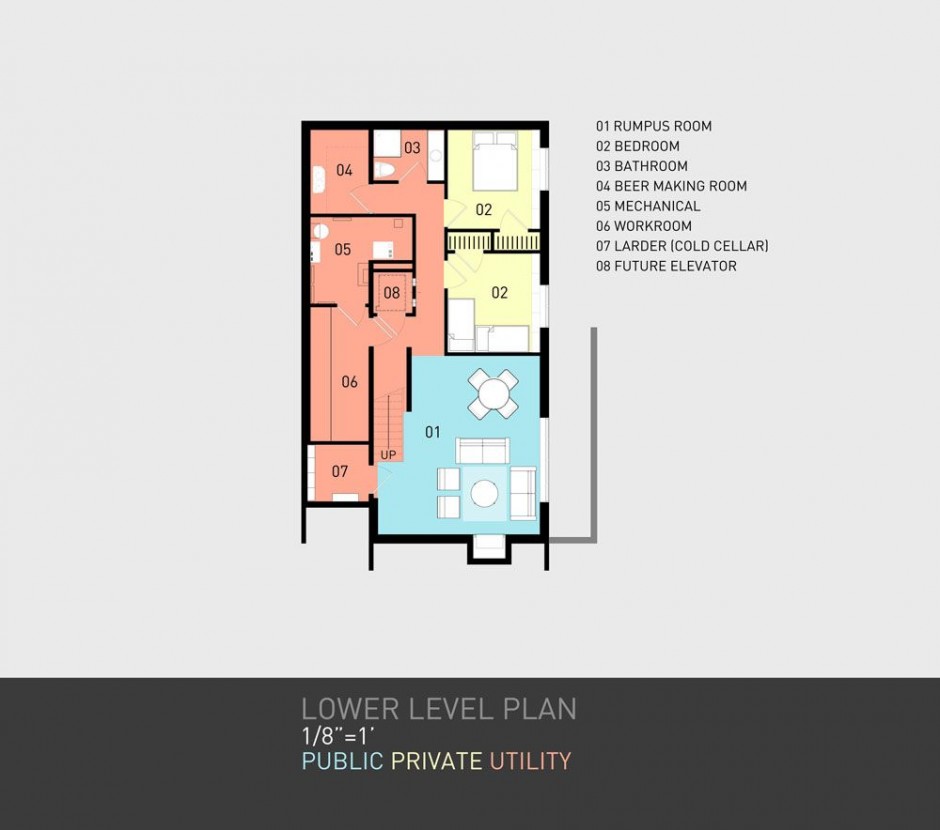 Dom je dvojpodlažný, podpivničený, so zastavanou plochou 250 m2 a jednoduchým pôdorysom. Prízemie je prevažne otvorené, veľká spoločná miestnosť slúži ako obývačka, jedáleň i kuchyňa. V severnej časti sa nachádza zimná záhrada spolu s terasou. Výrazný priestorový efekt prináša aj otvorené schodisko, ktoré spája jednotlivé podlažia. Pri vstupe na druhé podlažie sa nachádza študovňa spolu s priestranným šatníkom, ďalej spálňa s kúpeľňou. Na podzemnom podlaží nájdete ďalšie obytné miestnosti – pracovňu, kúpeľňu, technickú miestnosť, sklad a miestnosť na výrobu piva.