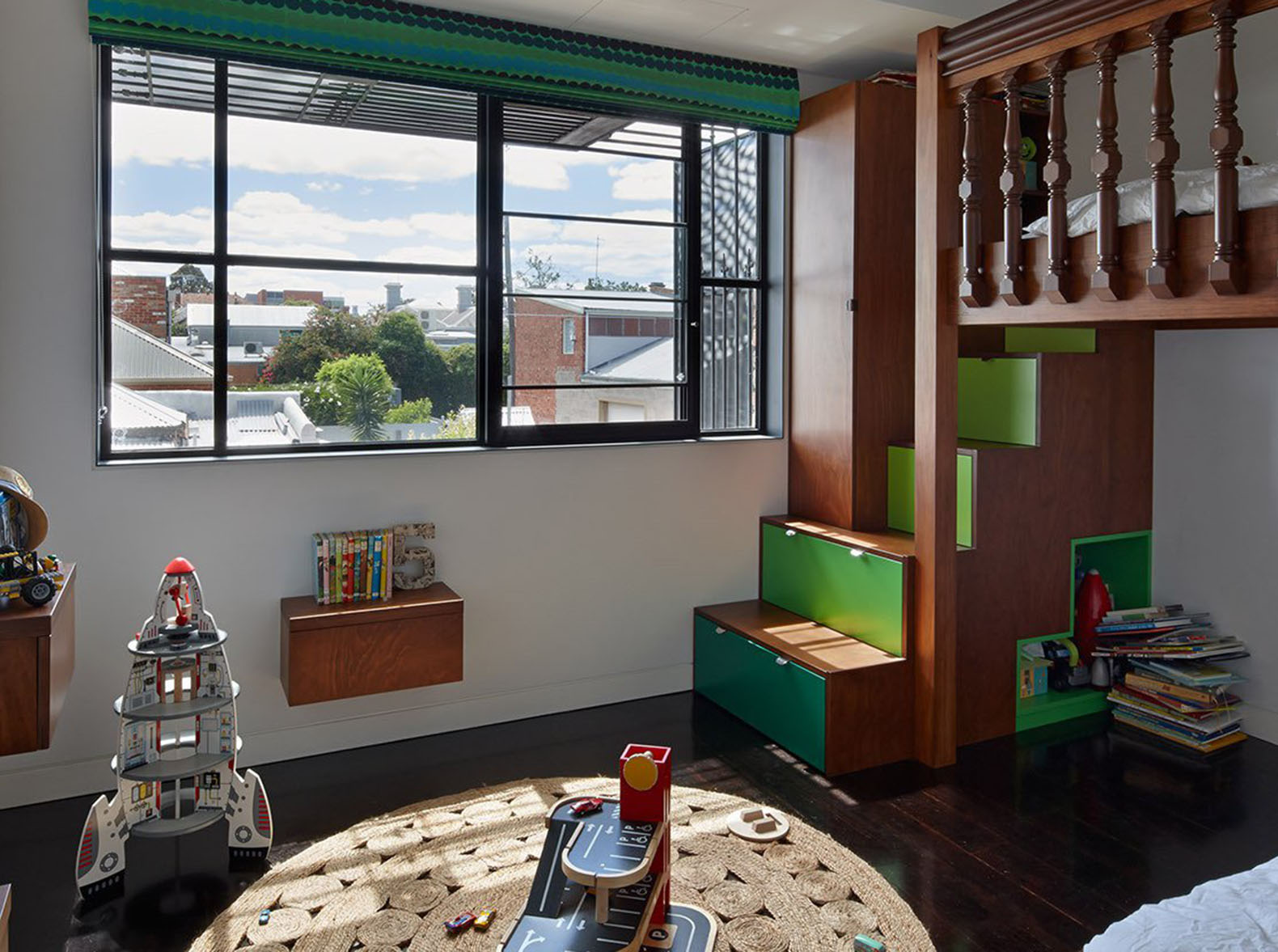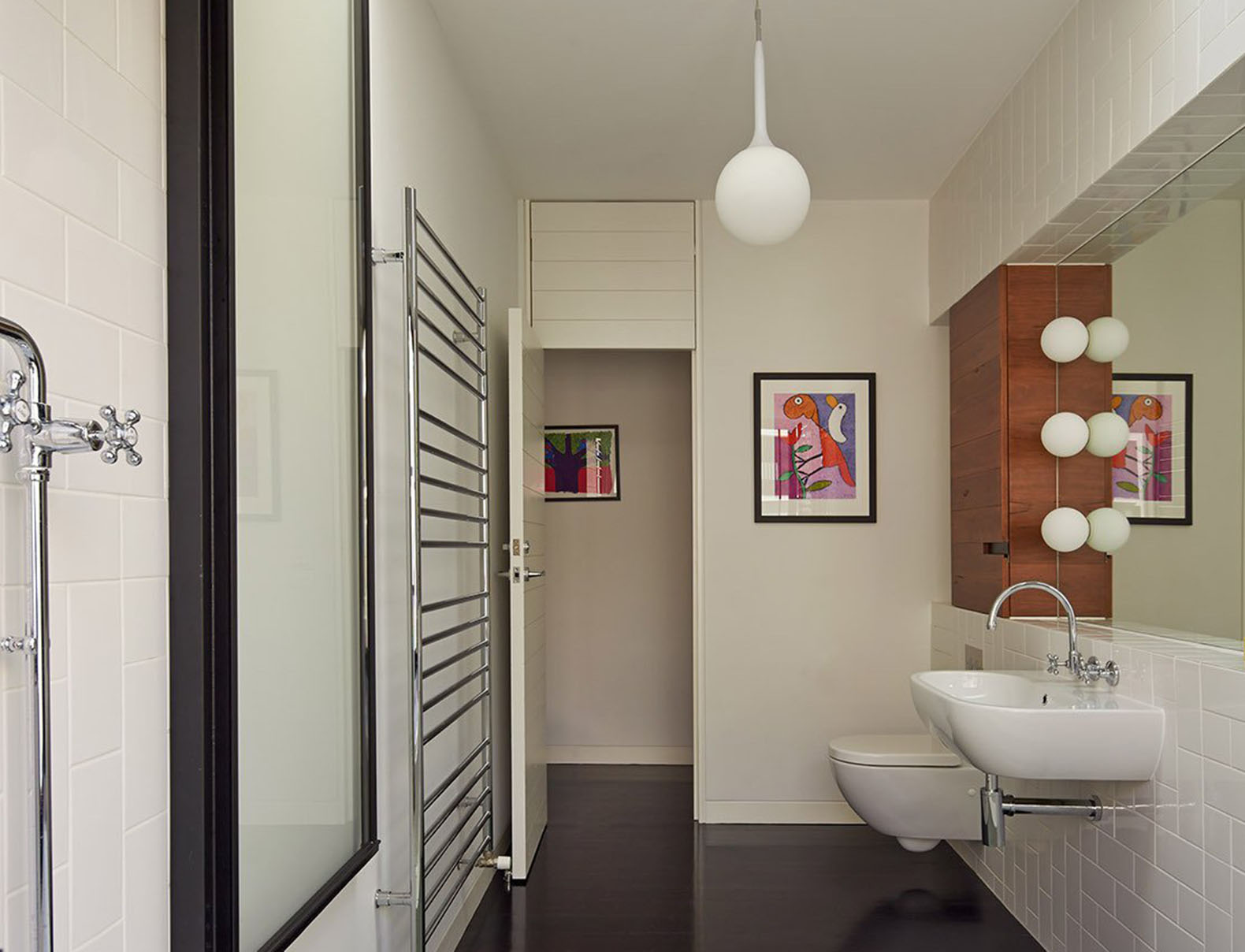 Opätovné využitie materiálov i prvkov sa prejavilo rovnako v exteriéri aj interiéri. Rúčky na otváranie skrine boli pôvodne súčasťou zábradlia.