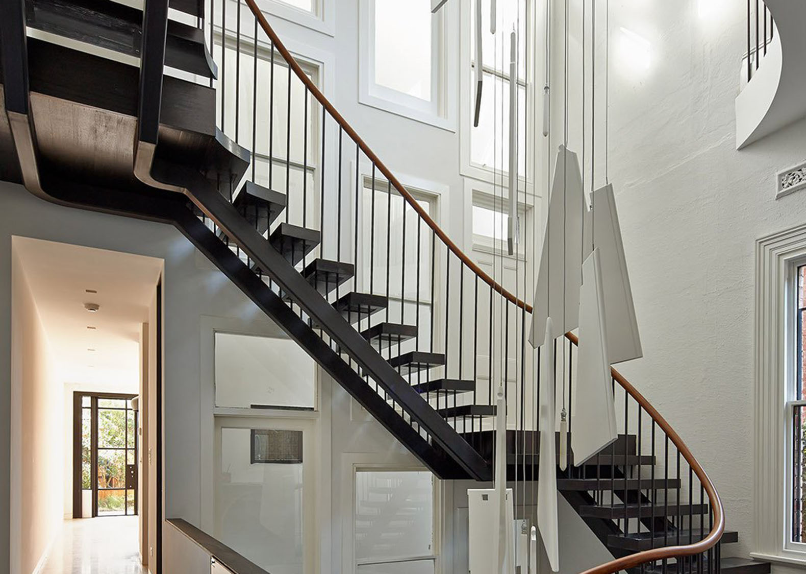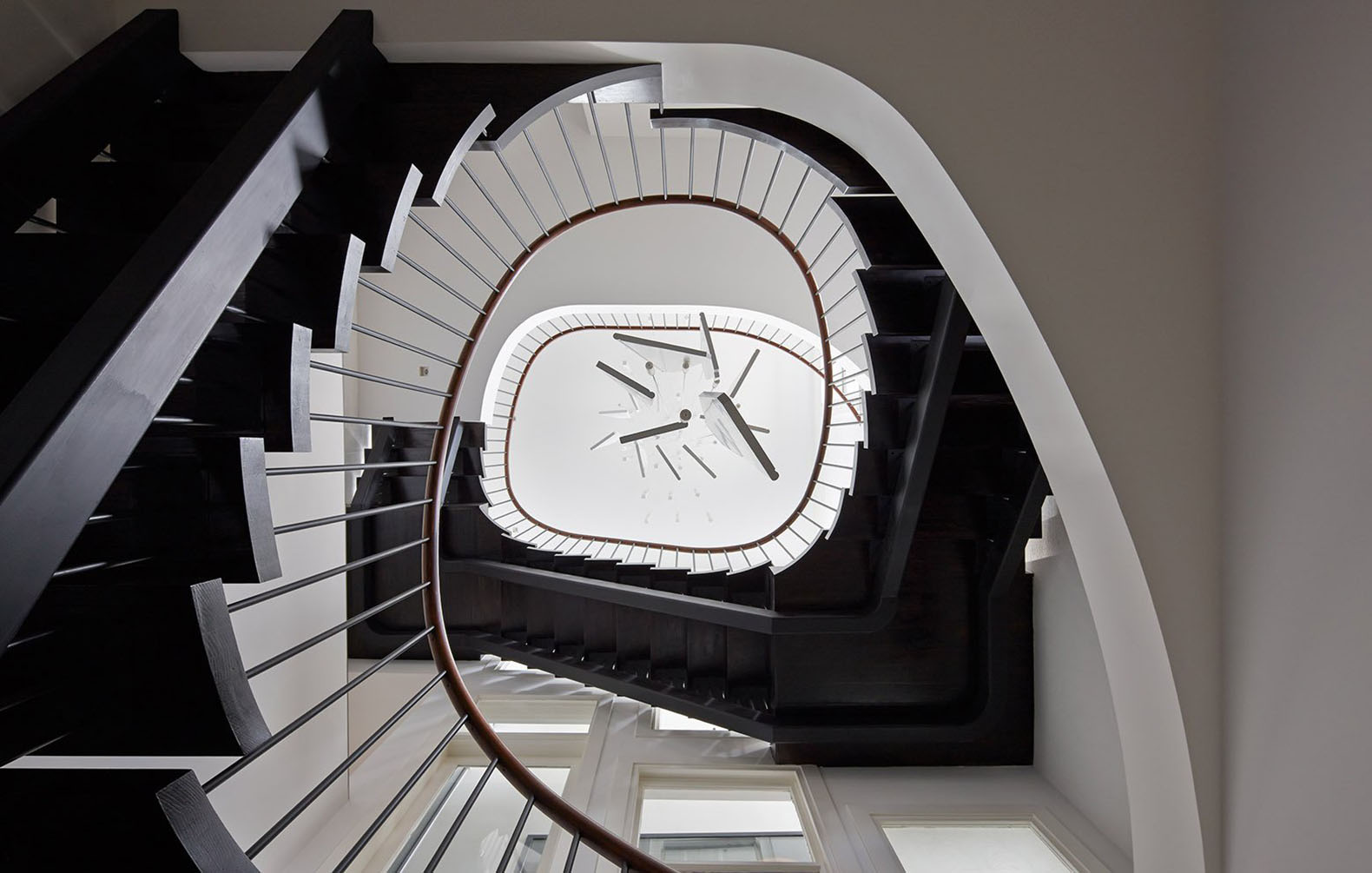 Schodisko privádza prirodzené svetlo na všetky tri poschodia a zároveň takto zabezpečuje prirodzenú ventiláciu.