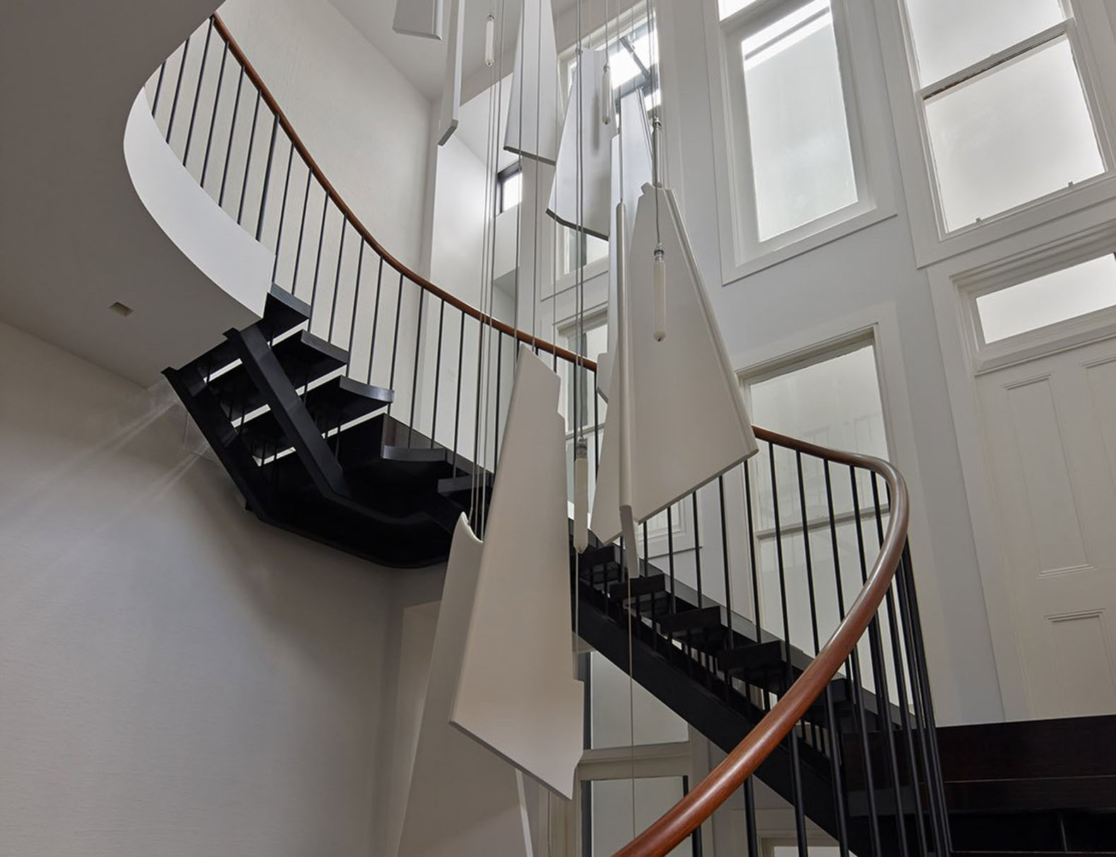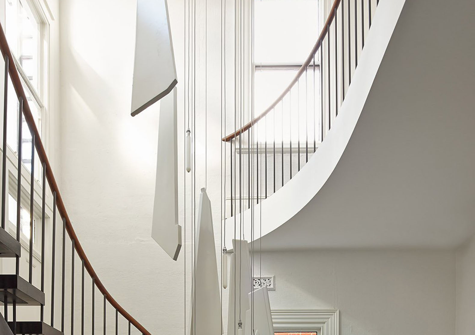 Až pri bližšom skúmaní možno postrehnúť, že elegantný luster tvoria schodnice a zábradlie z bývalého schodiska.