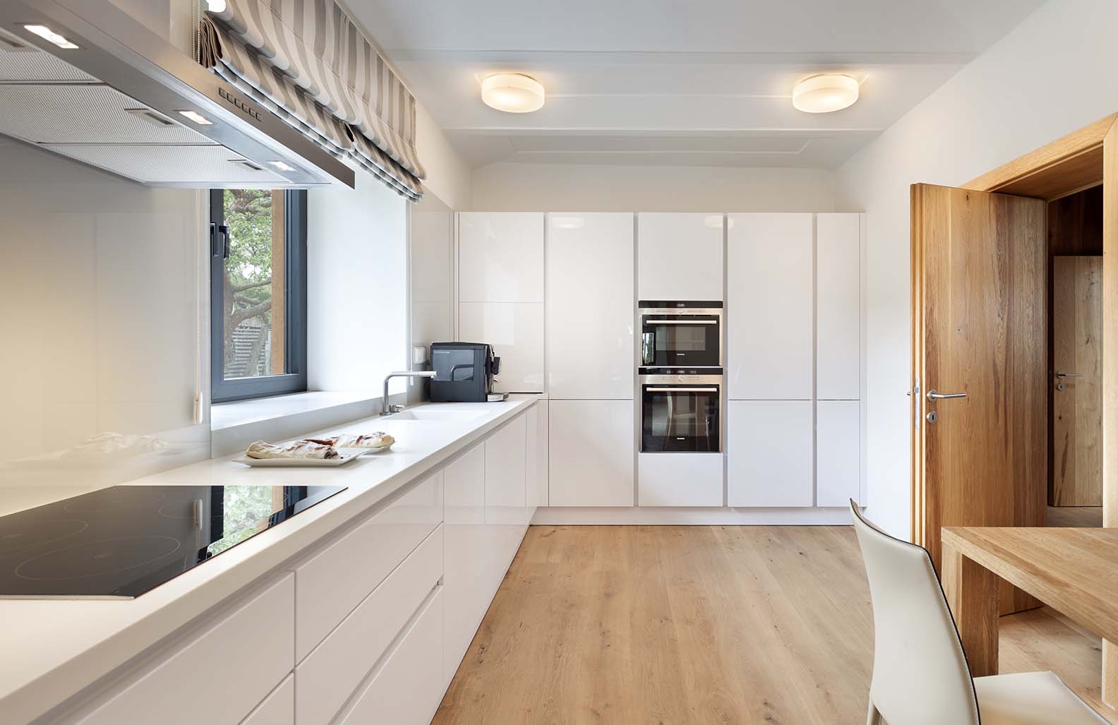 Podlahy sú z vrstvených dubových parkiet skladaných do vzoru „na remeň“. Rovnaký materiál bol zvolený aj na dvere, obklady stien a stropov a na nábytok.