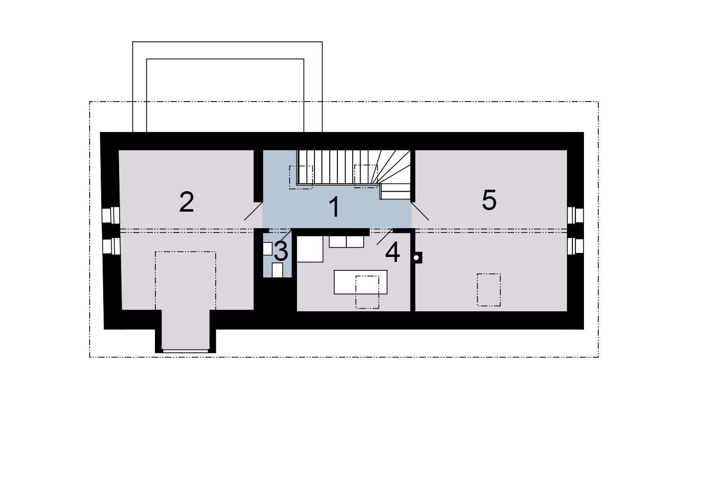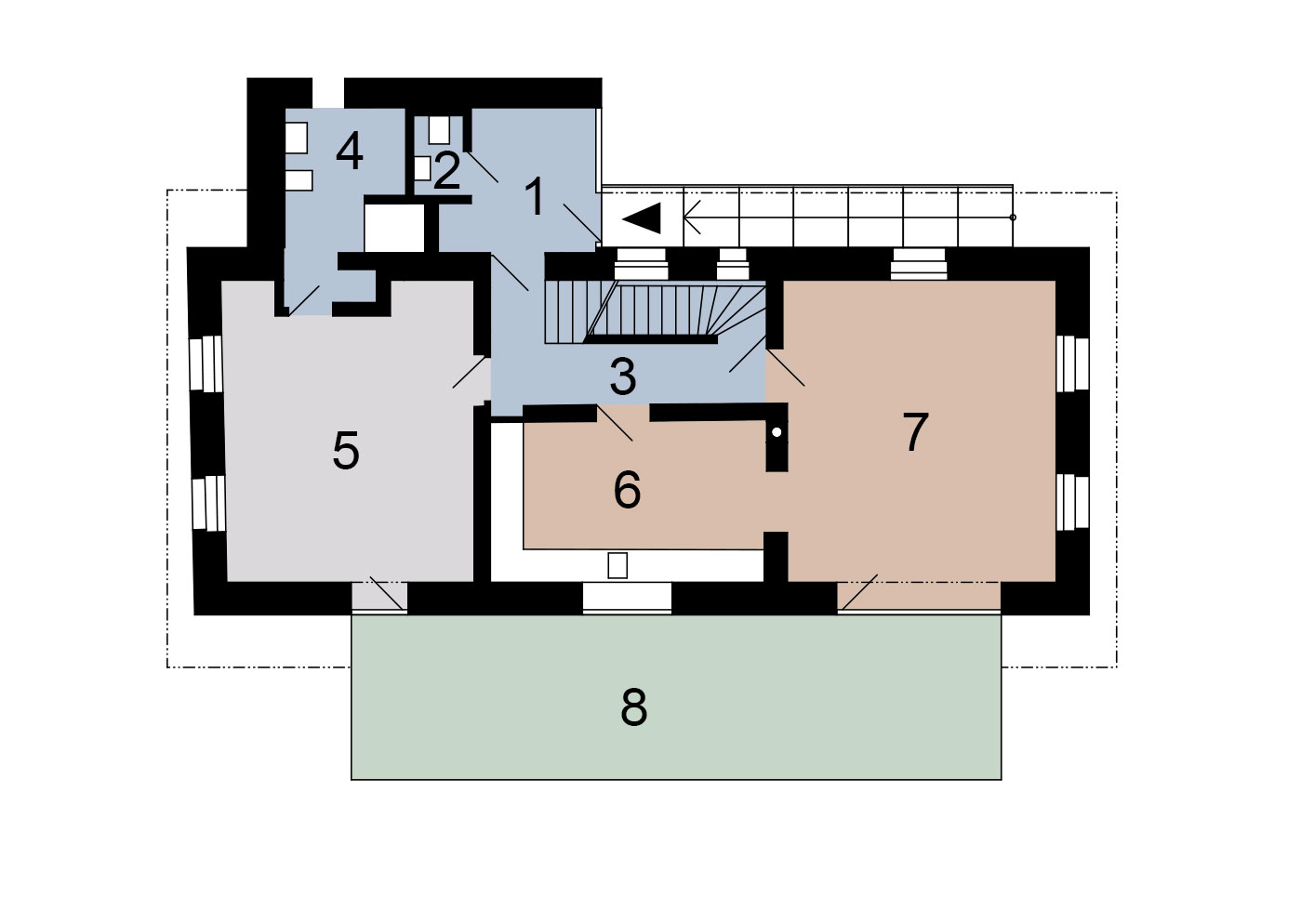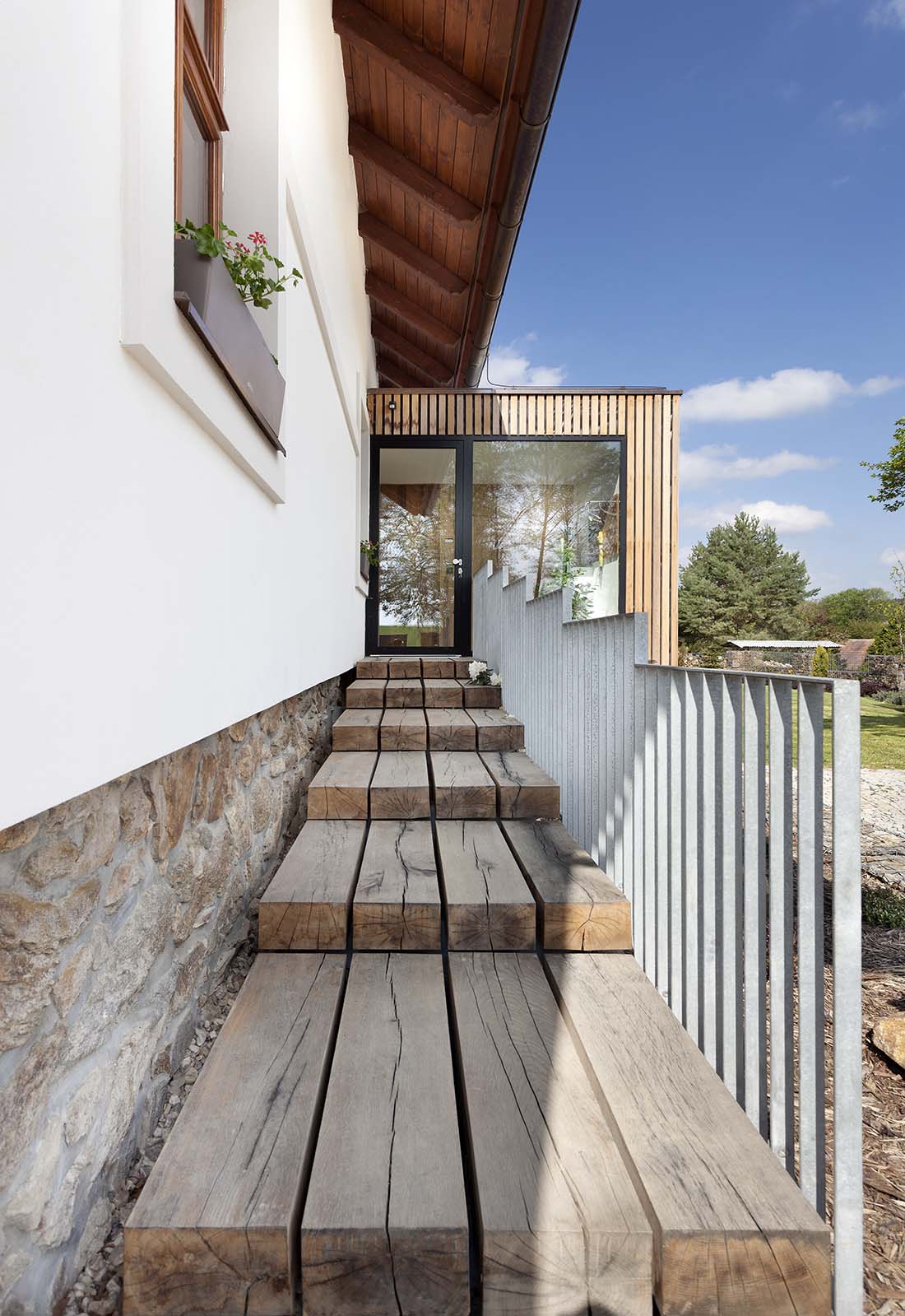Neoddeliteľnou súčasťou domu je aj jeho vstupný priestor s novým vjazdom z kamenných kusov a oplotenie z gabionov. Prichádzajúci nemôžu prehliadnuť ani nové vonkajšie schodisko z dubových podvalov. Súčasná vstupná časť prístavby je postavená na mieste bývalej verandy. Do prístavby je situované vstupné zádverie a novovybudované hygienické zázemie.