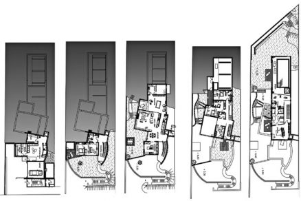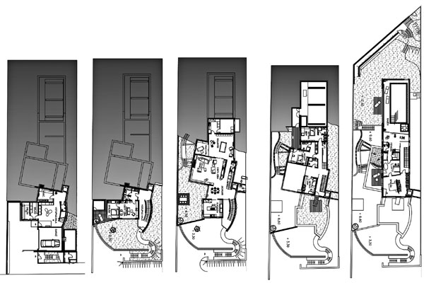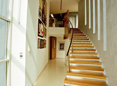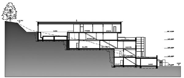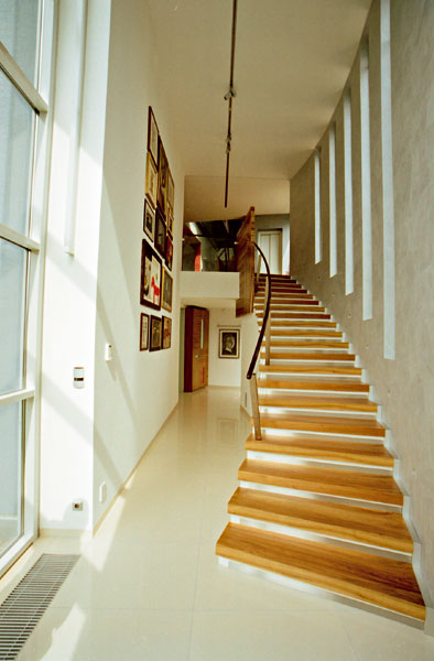 Základnou kostrou dispozície je sústava jednoramenných schodísk s komunikačnými halami, ktoré postupne stúpajú po severovýchodnej stene domu. Priehľady cez schodiská nahor i nadol vzbudzujú zvedavosť, otvárajú perspektívne výhľady do krajiny a dávajú tušiť dimenziu prostredia. Rozdielny dizajn jednotlivých schodiskových ramien, dynamika umelého osvetlenia s príznačnými konštruktivistickými líniami našepkávajú funkciu jednotlivých priestorov, celkovú kvalitu a atmosféru príjemného luxusu. K hlavnej komunikačnej osi schodísk sa smerom na juhozápad pripájajú obytné priestory domu – tie sú orientované na juh a juhozápad. Veľké otváracie plochy zasklených stien prepájajú jednotlivé priestory s rekreačnou záhradou.