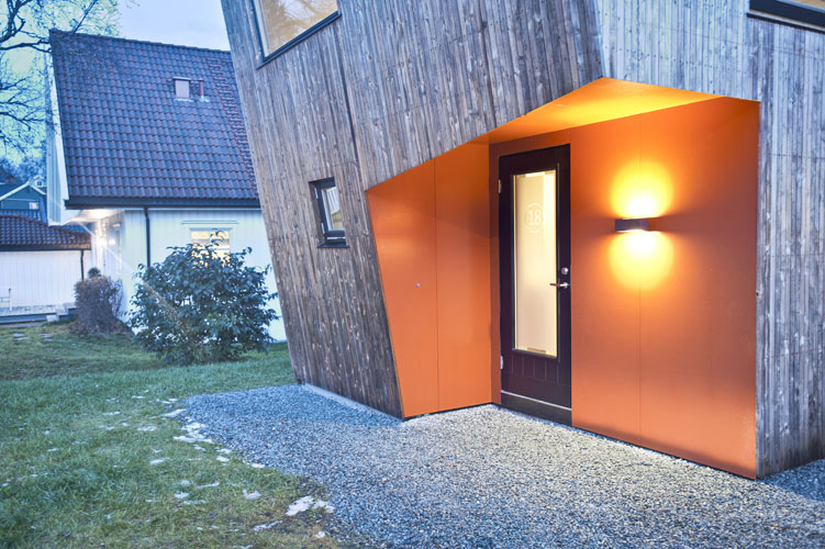 Fasáda je obkladaná úzkymi, zvislo uloženými borovicovými latami a vstup do domu je zvýraznený oranžovou farbou.