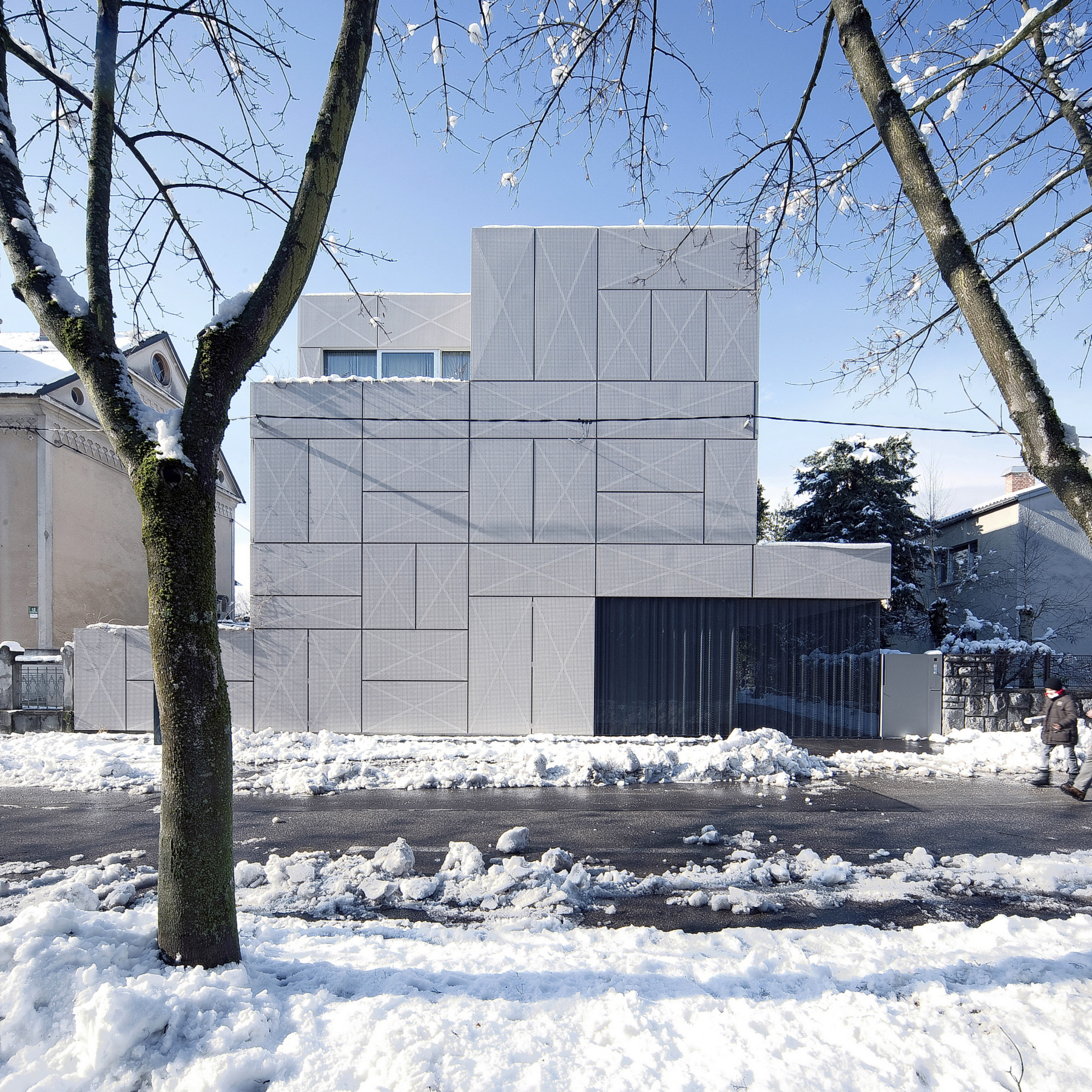 Projekt z dielne architektonického štúdia OFIS architekti sa začiatkom tohto roku dočkal svojho úspešného ukončenia. Moderná vila postavená na predmestí slovinskej Ľubľany svojím zovňajškom vyvoláva rozporuplné reakcie. Za nezvyčajným výzorom tohto trojposchodového rodinného domu stojí fasáda pokrytá dierovanými panelmi, ktoré vytvárajú textúru nepravidelnej mriežky.