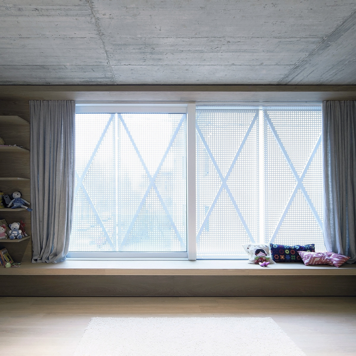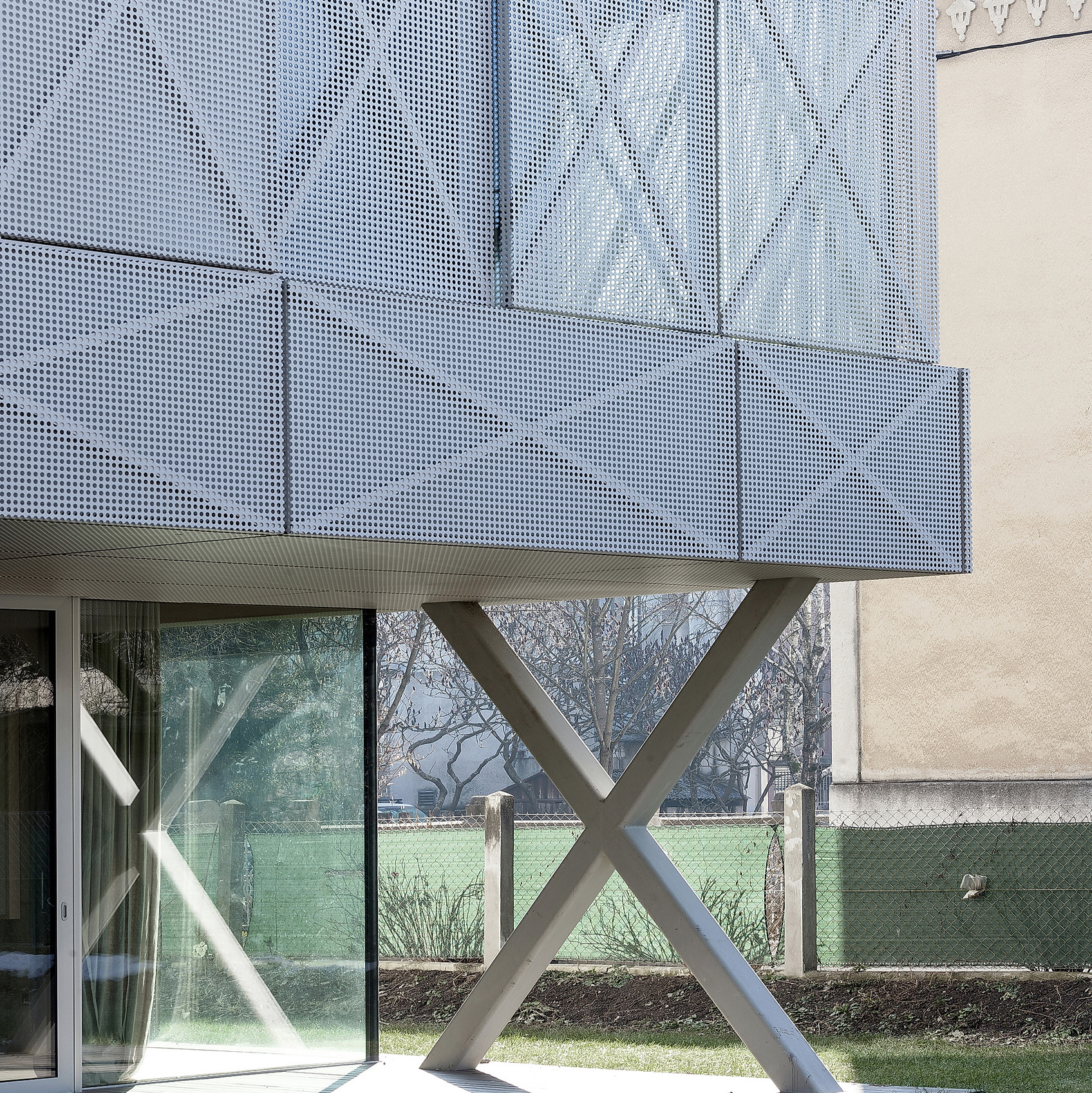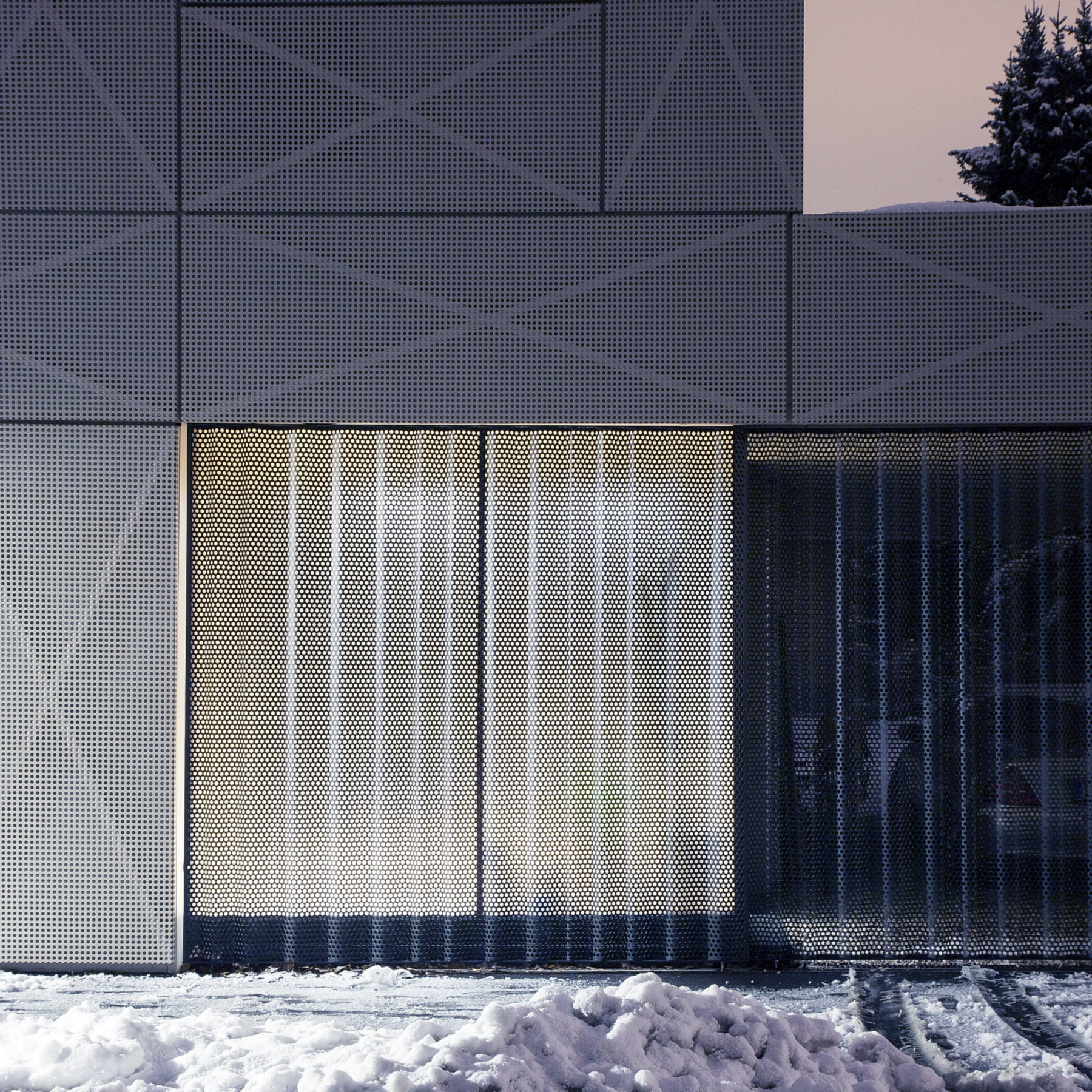 Kovová výstuha dierovaných panelov je viditeľná aj z exteriéru a zmierňuje tak strohý výzor sivej fasády.