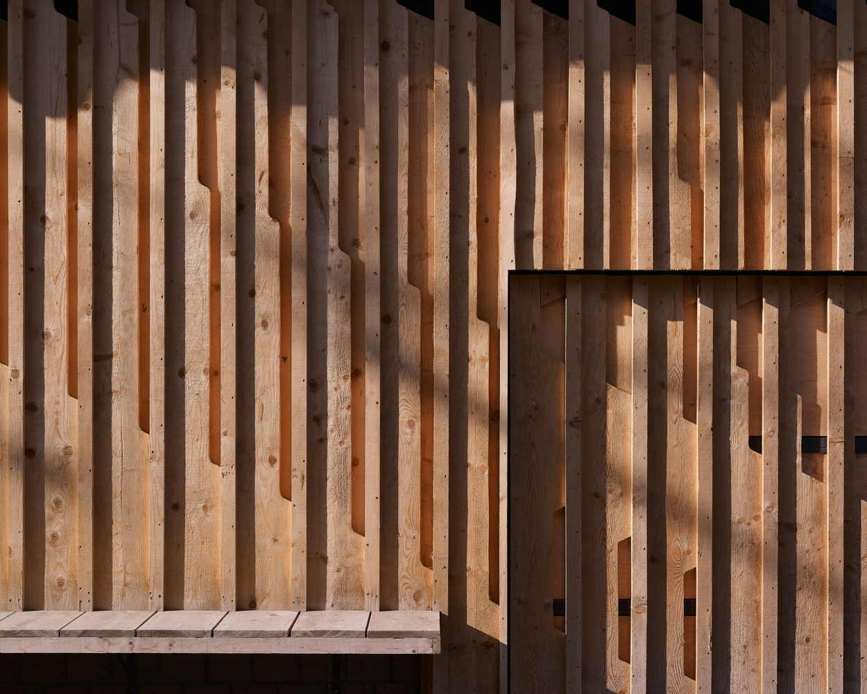 Jednoduchý moderný vzor vybrali tak, aby obloženie pripomínalo nepravidelné laty tradičnej stodoly. Aby zachovali jednotnosť plášťa, prekryli latami aj okná, takže svetlo preniká dovnútra iba cez prierezy medzi latami.