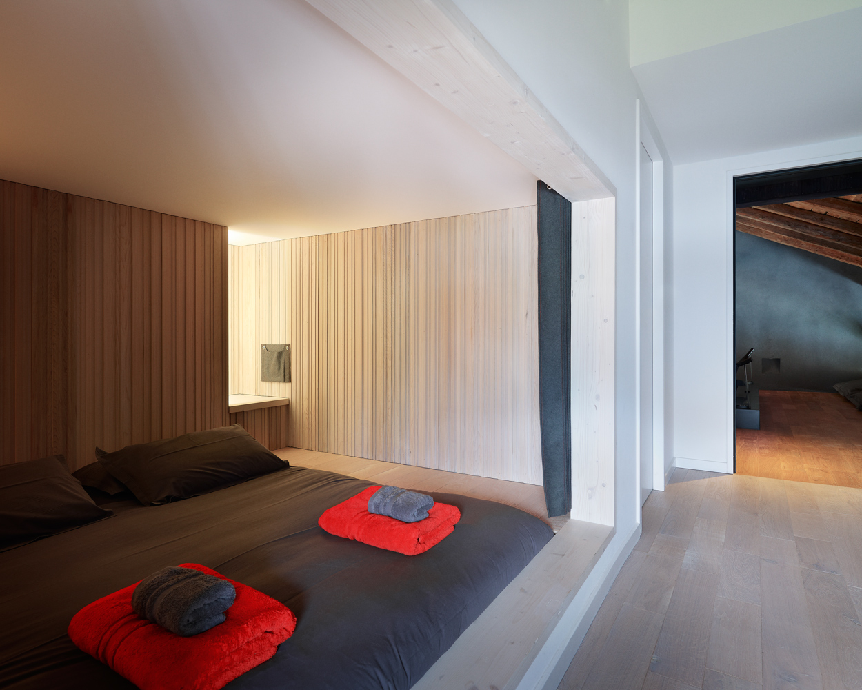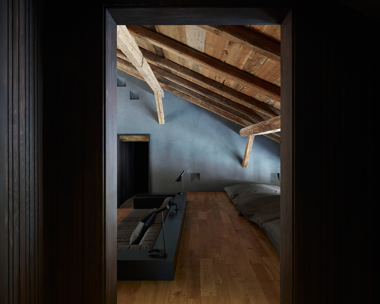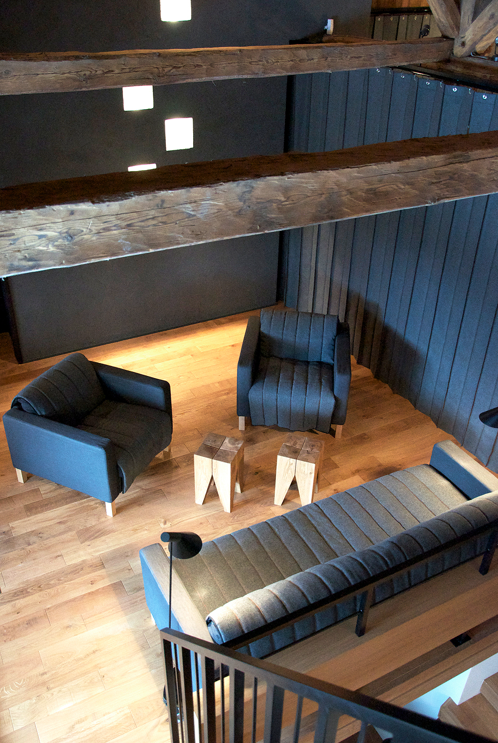 Jednotlivé funkcie sú pritom oddelené iba pocitovo, prípadne rozdielnymi úrovňami podlahy. Drevené prvky konštrukcie sú priznané v maximálnej možnej miere. Architekti im nechali prirodzenú farbu. Ako základný materiál interiéru si vybrali drevo. Aby vyniklo, ladili nábytok do odtieňov sivej a čiernej.