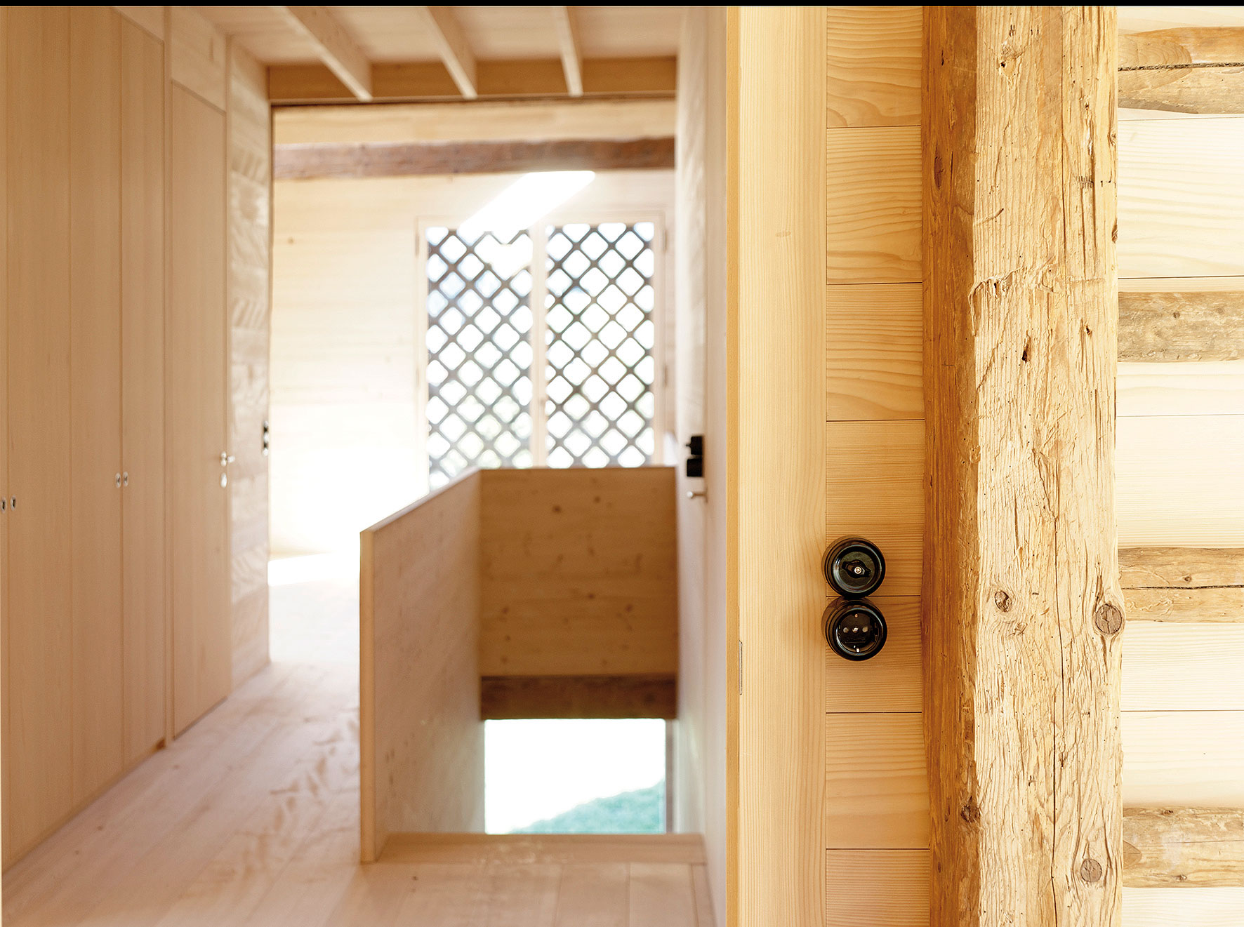 Rovnako v interiéri sú viditeľné pôvodné materiály – kamenný múr a niektoré drevené trámy. Hoci bola konštrukcia vystužená novými, tie pôvodné prepožičiavajú interiéru atmosféru starých čias. Všetky konštrukčné prvky sú zladené v rovnakom odtieni dreva. Priestor otvorený až ku krovu delia dosky z masívnej jedle bielej s hrúbkou 4 cm. Ide o miestny materiál a spolu s ďalšími ekologickými opatreniami, ako použitie a recyklácia materiálov z pôvodnej stavby alebo minimálne využitie lepeného dreva, prispieva k udržateľnosti projektu.